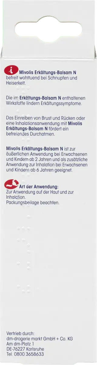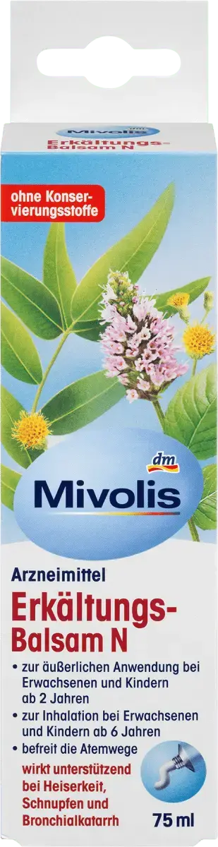 Mivolis Cold Balm N обеспечивает успокаивающее облегчение при простуде и охриплости голоса. Активные ингредиенты, содержащиеся в Cold Balm N, облегчают симптомы простуды. Растирание груди и спины или ингаляционные аппликации Миволис Колд Бальзам Н подходят для наружного применения у взрослых и детей от 2 лет и в качестве дополнительного применения для ингаляций у взрослых и детей от 6 лет.