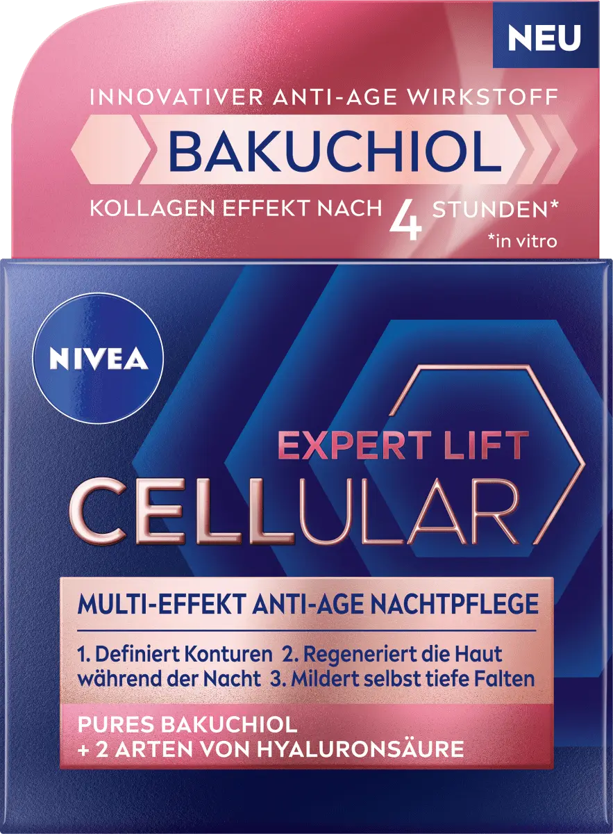 NIVEA Cellular Expert Lift Ночной крем Multi-Effect Anti-Age с бакучиолом в качестве альтернативы ретинолу — идеальный ночной крем против старения для молодо выглядящей кожи. Инновационная формула увеличивает активность клеток глубоко в коже и помогает укрепить кожу. Pure Bakuchiol, новое поколение антивозрастных активных ингредиентов от NIVEA и гиалуроновой кислоты, поддерживает выработку коллагена уже через 4 часа после нанесения. Они обеспечивают коже интенсивное увлажнение, разглаживают ее и заметно уменьшают морщины.