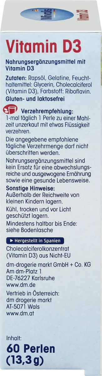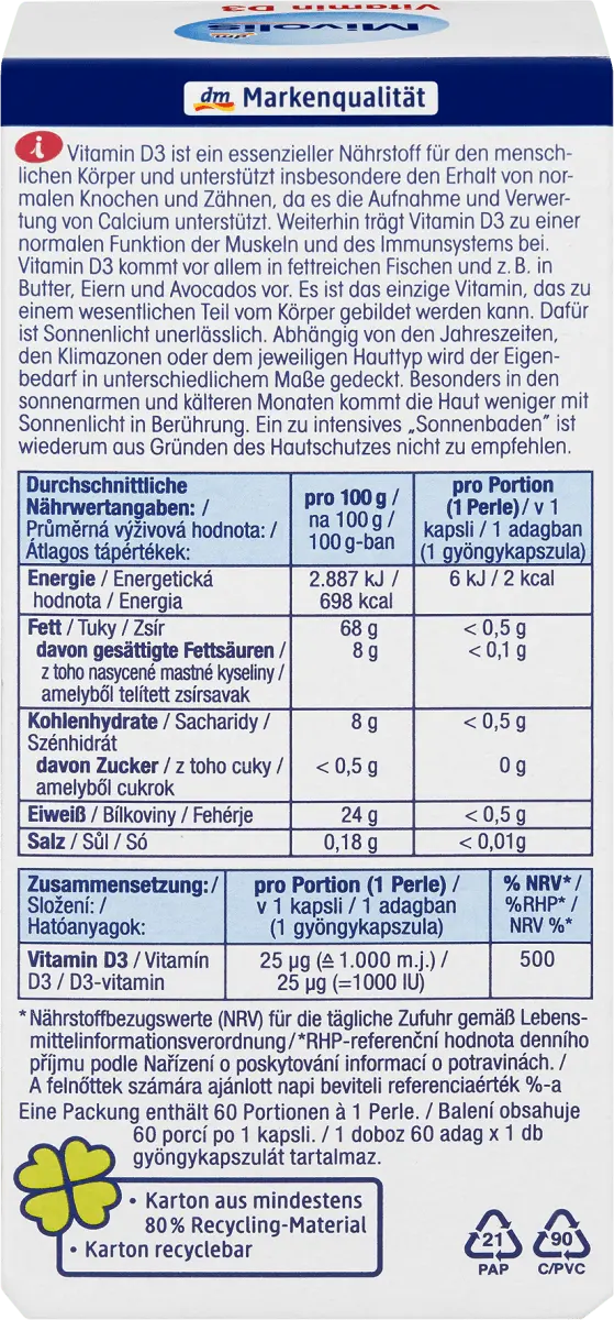 Витамин D3 представляет собой необходимое питательное вещество для организма человека и особенно поддерживает поддержание нормальных костей и зубов, поскольку способствует усвоению и использованию кальция. Кроме того, витамин D3 способствует нормальной функции мышц и иммунной системы. Витамин D3 в основном содержится в жирной рыбе и, например, в сливочном масле, яйцах и авокадо. Это единственный витамин, который в значительной степени может вырабатываться в организме. Для этого необходим солнечный свет. В зависимости от времени года, климатических зон или соответствующего типа кожи ваши потребности в разной степени удовлетворяются. Особенно в холодные месяцы, когда солнца мало, кожа меньше контактирует с солнечным светом. Слишком интенсивные «загорания» не рекомендуются из соображений защиты кожи.