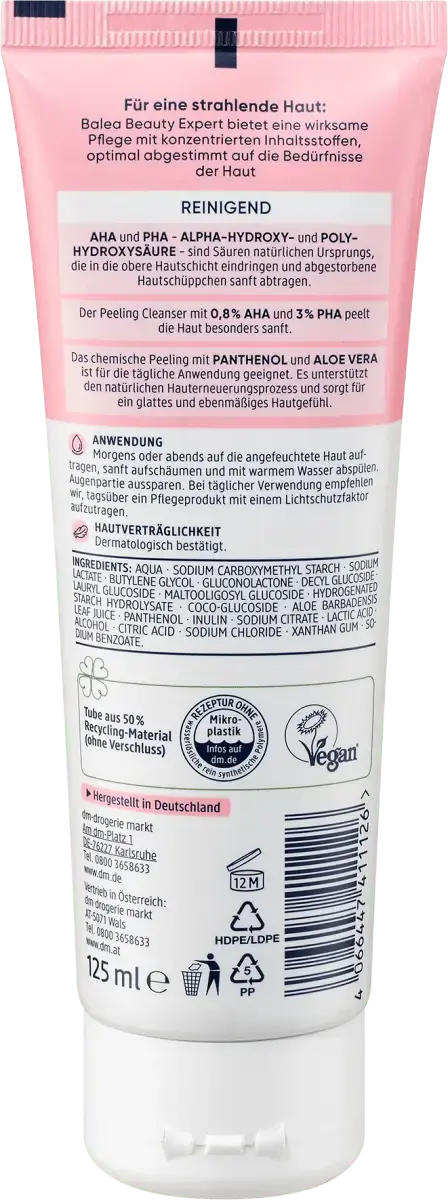 Balea Beauty Expert Peeling Cleanser предлагает эффективный уход с помощью концентрированных ингредиентов, оптимально адаптированных к потребностям кожи. AHA и PHA – Альфа-гидрокси и полигидроксикислоты – это кислоты природного происхождения, которые проникают в верхний слой кожи и мягко удаляют омертвевшие клетки кожи. Очищающее средство-пилинг с содержанием AHA 0,8% и PHA 3% особенно мягко отшелушивает кожу. Химический пилинг с пантенолом и алоэ вера подходит для ежедневного применения. Он поддерживает естественный процесс обновления кожи и делает ее гладкой и ровной. Значение pH: 4,0–5,0. Формула без микропластика и водорастворимых, чисто синтетических полимеров. Продукт соответствует Руководству по красоте Balea Clean - www.dm.de/balea