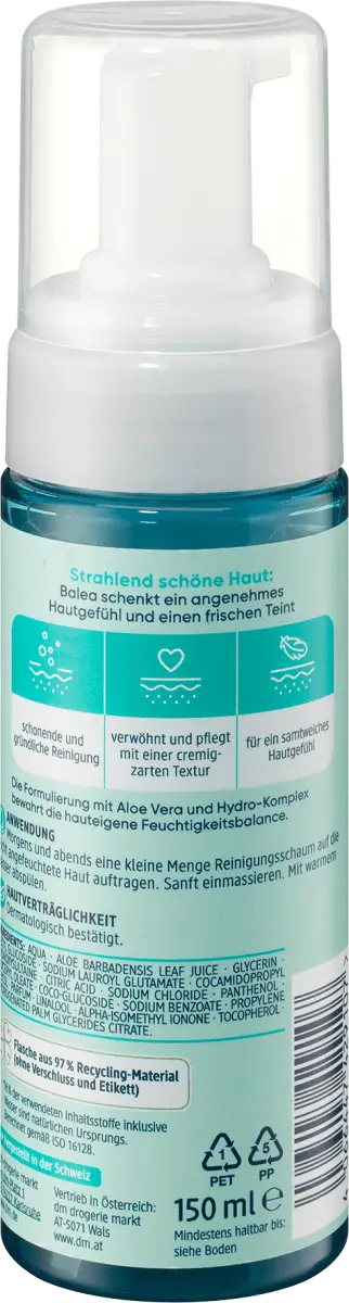 Тщательное и нежное очищение: нежная очищающая пенка Balea балует и питает кожу с кремово-нежной текстурой. Для свежего ухода за кожей. Формула увлажняющего ухода с алоэ вера и гидрокомплексом поддерживает баланс влаги в коже. Формула обеспечивает глубокое очищение и ощущение мягкости кожи. Рецепт без микропластика и водорастворимых, чисто синтетических полимеров.