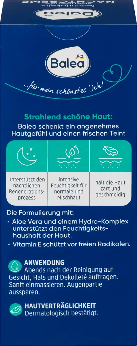Для сияющего пробуждения утром: увлажняющий ночной крем Balea поддерживает кожу в ночное время процесс регенерации. Ценное алоэ вера и гидрокомплекс интенсивно увлажняют кожу и поддерживают ее водный баланс. Формула ухода с витамином Е поддерживает процесс ночной регенерации кожи и защищает от свободных радикалов. Для эластичной, нежной кожи. Рецепт без микропластика и водорастворимых, чисто синтетических полимеров.