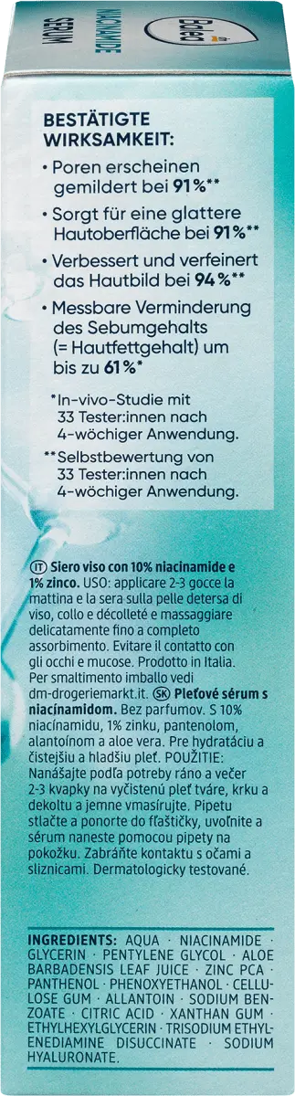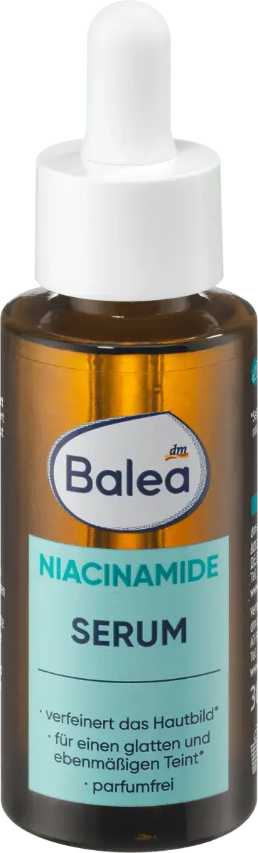 Многогранный талант для красивой и укрепленной кожи: ниацинамид Balea поддерживает кожный барьер и улучшает внешний вид кожи. СЫВОРОТКА улучшает цвет лица** и делает поверхность кожи более гладкой*. 10% НИАЦИНАМИД сужает расширенные поры и укрепляет естественный кожный барьер. 1% ЦИНК оказывает себорегулирующее действие, подходит также для жирной и комбинированной кожи. Комбинация активных ингредиентов с ПАНТЕНОЛОМ, АЛЛАНТОИНОМ и АЛОЭ ВЕРА способствует регенерации кожи и обеспечивает успокаивающее увлажнение.** *Исследование in vivo с участием 33 тестеров после 4 недель использования. **Самооценка 33 тестеров после 4 недель использования. Значение pH: 4,5 Рецепт без микропластика и водорастворимых, чисто синтетических полимеров. Продукт соответствует Руководству по красоте Balea Clean - www.dm.de/balea