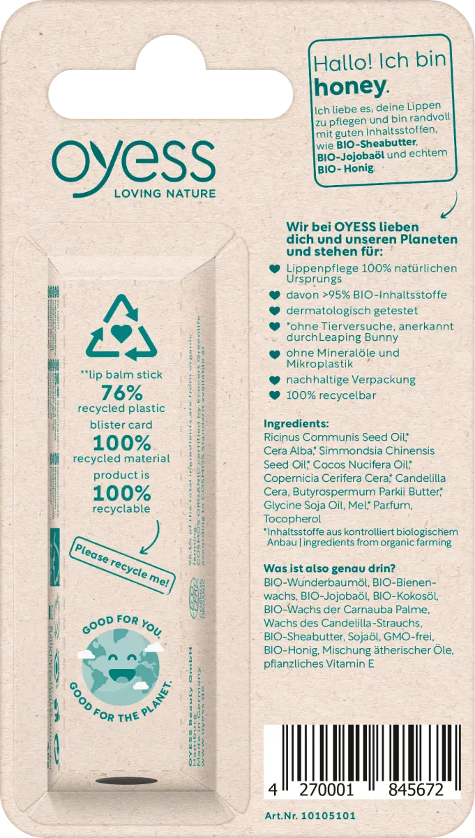 Мёд Без него уже невозможно представить нашу повседневную жизнь. Бальзам для губ из ойсса мгновенно устраняет сухие, потрескавшиеся губы благодаря настоящему органическому меду. Натуральный уход за губами обеспечивает длительное увлажнение и сохраняет губы бархатистыми и мягкими. Кроме того, питательный состав с маслом ши и органическим маслом жожоба имеет 100-процентное натуральное происхождение. Уникальный запах очаровывает вас типичным сладким медовым ароматом, как только вы его наносите. oyess - Для ухоженных губ. *Упаковка содержит не менее 70 % переработанного материала.