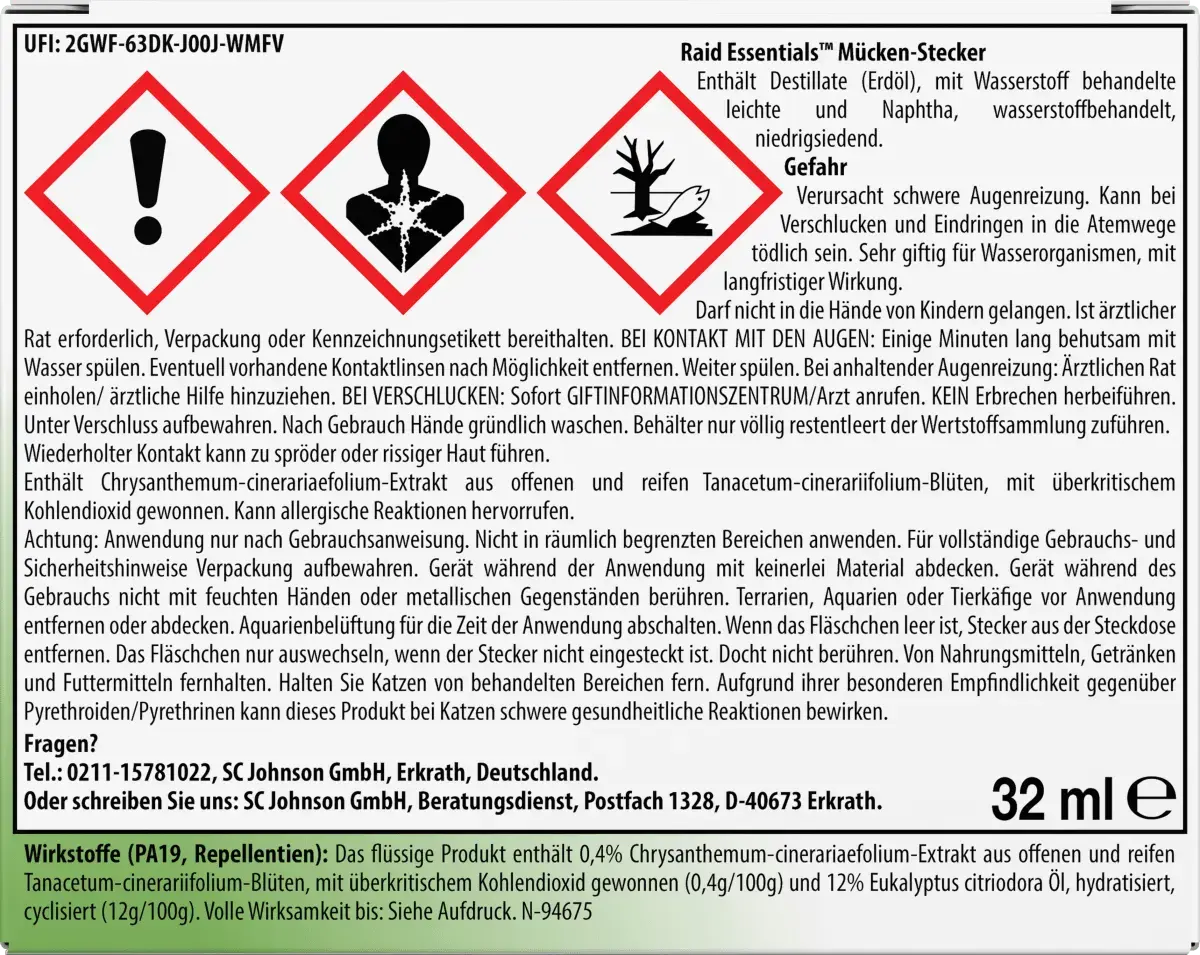 Raid Essentials от комаров Plug обеспечивает оптимальную защиту от комаров и тигровых комаров благодаря активным ингредиентам растительного происхождения и без добавления ароматизаторов. Активные ингредиенты, полученные из частей растения хризантемы и листьев эвкалипта, обеспечивают надежную долговременную защиту от комаров. Противомоскитная заглушка защищает от комаров и тигровых комаров до 45 ночей или дней (по 8 часов каждый) и подходит для помещений площадью до 30 м³. В больших помещениях используйте больше устройств. Как только активный ингредиент будет израсходован, просто наполните его новым блоком, чтобы сохранить защиту. Световой индикатор указывает на то, что устройство активно. Для получения оптимальных результатов активируйте устройство за 60 минут.