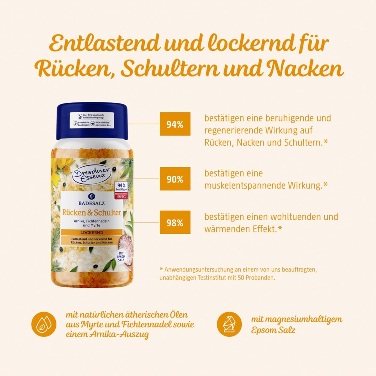 Соль для ванн спины и плеч от Dresdner Essenz оказывает особенно успокаивающее и балансирующее действие в сочетании с теплой водой. . Соль Эпсома содержит высокое содержание магния и обеспечивает ощущение расслабления. Соль также обогащена натуральными эфирными маслами мирта и ели, а также экстрактом арники. Для расслабляющих моментов.