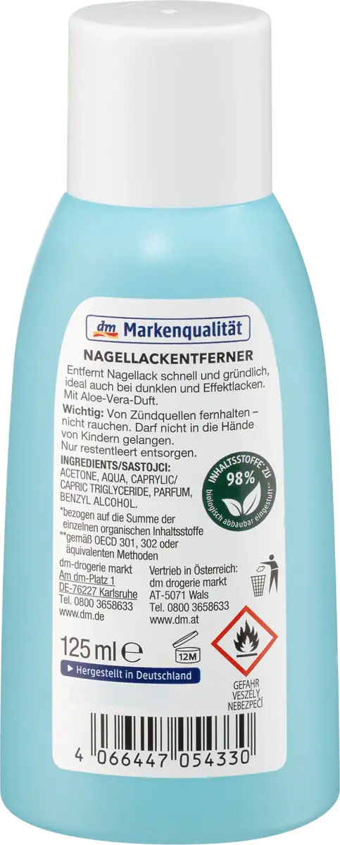 Содержащая ацетон жидкость для снятия лака от ebelin удаляет лак быстро, тщательно и бережно. также идеально подходит для темных красок и красок с эффектами. Он также побалует вас приятным ароматом алоэ вера. Ингредиенты классифицируются как биоразлагаемые на 98%.