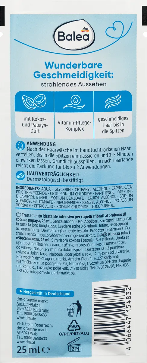 Восстанавливающее средство Balea обеспечивает увлажнение легкое расчесывание и эластичность. Благодаря своей формуле ухода с противосухим эффектом, он разглаживает поверхность волос и питает их. Сухие, поврежденные волосы приобретают больший блеск и эластичность, а формула ухода защищает волосы от высыхания. Строительный комплекс с витамином B3 и провитамином B5 также сохраняет ваши волосы эластичными. Рецепт без микропластика и чисто водорастворимых синтетических полимеров.