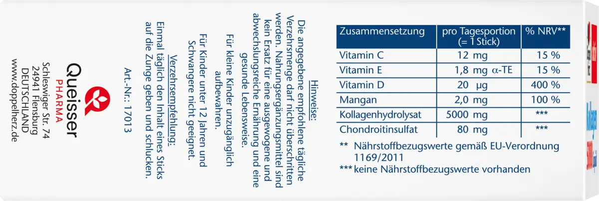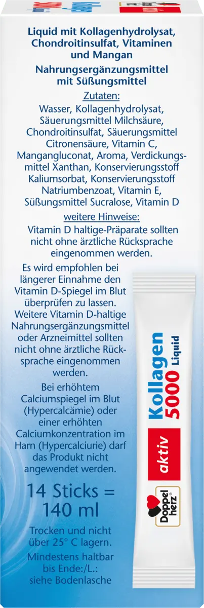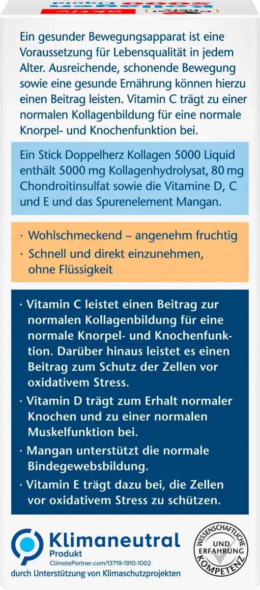 Одна палочка Doppelherz Collagen 5000 Liquid содержит 5000 мг гидролизата коллагена, 80 мг хондроитинсульфата, а также витамины. D, C и E и микроэлемент марганец. Здоровый опорно-двигательный аппарат – необходимое условие качества жизни в любом возрасте. Этому могут способствовать адекватные, легкие физические упражнения и здоровое питание. Витамин С также способствует нормальному образованию коллагена для нормальной функции хрящей и костей.