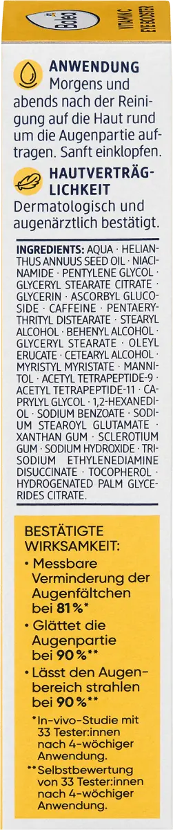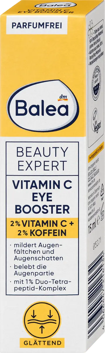 Описание продукта 2% витамин С, 2% кофеин + 1% комплекс дуо-тетрапептидов Разглаживание Уменьшает морщины под глазами и темные круги, бодрит область вокруг глаз Без отдушек br>Состав без микропластика и водорастворимых, чисто синтетических полимеров. Для сияющей кожи: Balea Beauty Expert предлагает эффективный уход с концентрированными ингредиентами, оптимально адаптированными к потребностям кожи. ВИТАМИН С способствует выработке коллагена, уменьшает видимые признаки старения кожи и оказывает осветляющий эффект. КОФЕИН способствует микроциркуляции кожи. Формула с 2% ВИТАМИНА С в форме стабильного производного аскорбил глюкозида и 2% КОФЕИНА осветляет область вокруг глаз и уменьшает морщины под глазами, а также появление мешков под глазами и темных кругов под глазами. 1% ДУО-ТЕТРАПЕПТИДНЫЙ КОМПЛЕКС укрепляет кожу и эффективно уменьшает гусиные лапки и морщины в области глаз. В сочетании с 5% НИАЦИНАМИДОМ целенаправленный уход за глазами укрепляет нежную область вокруг глаз, уменьшает видимые признаки старения кожи и осветляет темные круги под глазами **. Для области вокруг глаз, излучающей энергию.** * Исследование in vivo с участием 33 тестеров после 4 недель использования. ** Самооценка 33 тестеров после 4 недель использования. Значение pH: 5,0 – 5,5. Рецептура без микропластика и водорастворимых, чисто синтетических полимеров. Продукт соответствует Руководству по чистой красоте Balea - www.dm.de/balea Состав AQUA, МАСЛО СЕМЯН HELIANTHUS ANNUUS, НИАЦИНАМИД, ПЕНТИЛЕНГЛИКОЛЬ, ГЛИЦЕРИЛСТЕАРАТ ЦИТРАТ, ГЛИЦЕРИН, АСКОРБИЛГЛЮКОЗИД, КОФЕИН, ПЕНТАЭРИТРИТИЛДИСТАРАТ, СТЕАРИЛОВЫЙ СПИРТ, БЕГЕНИЛОВЫЙ СПИРТ, ГЛИЦЕРИЛСТЕАРАТ, ОЛЕЙЛЭРУКАТ, ЦЕТЕАРИЛОВЫЙ АЛКОГОЛЬ, МИРИСТИЛМИРИСТАТ, МАННИТОЛ, АЦЕТИЙ L ТЕТРАПЕПТИД-9, АЦЕТИЛ ТЕТРАПЕПТИД-11, КАПРИЛИЛ ГЛИКОЛЬ, 1,2-ГЕКСАНДИОЛ, БЕНЗОАТ НАТРИЯ, СТЕАРОИЛГЛУТАМАТ НАТРИЯ. Нанесите на область вокруг глаз и аккуратно втирайте. Дерматологически протестировано.