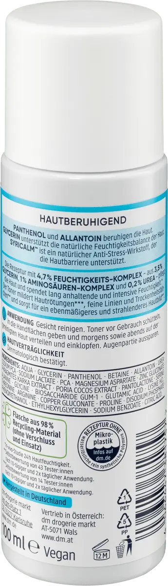 Balea Beauty Expert предлагает эффективный уход с использованием концентрированных ингредиентов, оптимально адаптированных к потребностям кожи. ПАНТЕНОЛ и АЛЛАНТОИН успокаивают кожу. ГЛИЦЕРИН поддерживает естественный водный баланс кожи. SYRIICALM — натуральный антистрессовый ингредиент, поддерживающий кожный барьер. Формула с 4,7% УВЛАЖНЯЮЩИМ КОМПЛЕКСОМ, состоящим из 3,5% ГЛИЦЕРИНА, 1% АМИНОКИСЛОГО КОМПЛЕКСА и 0,2% МОЧЕВИНЫ, питает кожу и обеспечивает длительное и интенсивное увлажнение.* Тонер уменьшает покраснения кожи***, мелкие и глубокие морщины. из-за сухости** и обеспечивает более ровный и сияющий цвет лица**. *In vivo исследование 24-часовой влажности кожи. **Самооценка 43 тестировщиков через 10 дней при двукратном ежедневном использовании. ***Самооценка 14 тестировщиков через 10 дней при двукратном ежедневном использовании. Значение pH: 4,5 – 5,5. Рецептура без микропластика и водорастворимых, чисто синтетических полимеров. Продукт соответствует Руководству по красоте Balea Clean - www.dm.de/balea