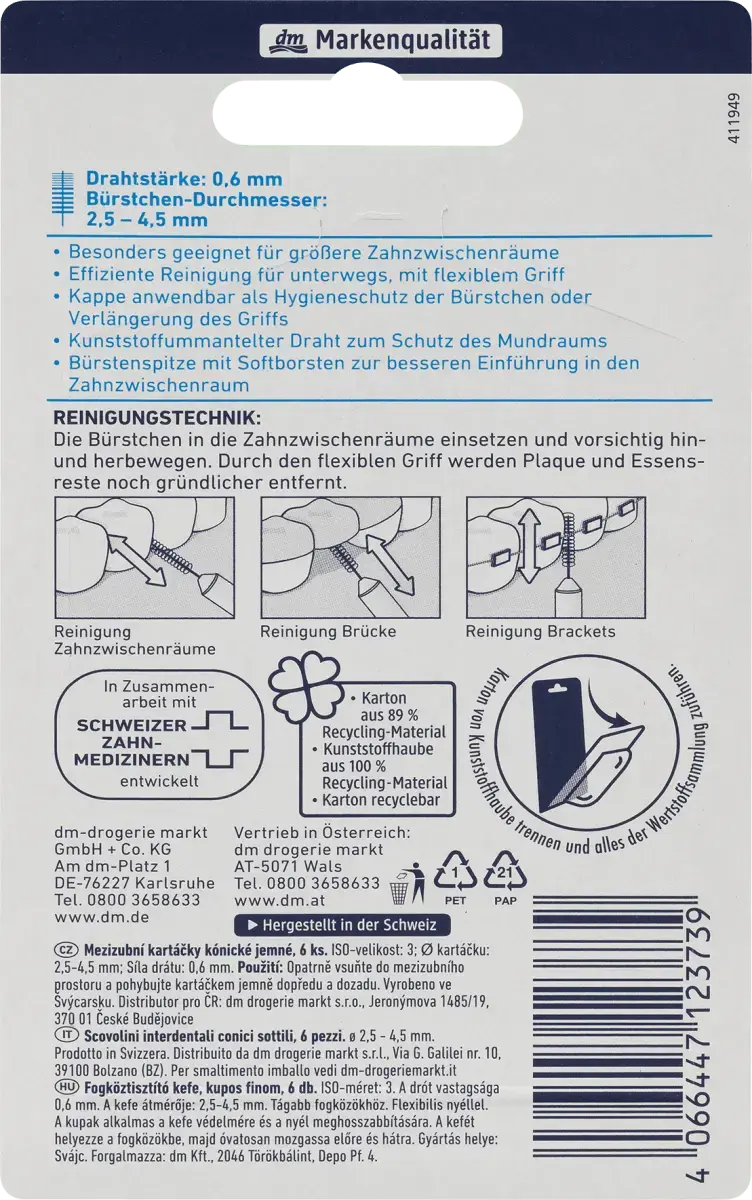 Техника чистки: Вставьте щетки в промежутки между зубами и перемещайте их. осторожно туда-сюда. Гибкая ручка еще более тщательно удаляет налет и остатки пищи.