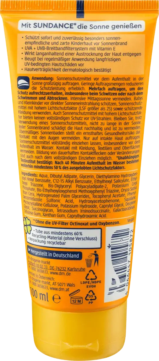 Веганский детский солнцезащитный крем SUNDANCE SPF 50 мгновенно и надежно защищает особенно чувствительную к солнцу и нежную детскую кожу от солнечных ожогов. Он оказывает долгосрочное действие против высыхания кожи и при регулярном использовании предотвращает долговременное повреждение кожи, вызванное ультрафиолетом, благодаря системе широкополосных фильтров UVA+UVB и витамину Е. Совместимость с кожей также подтверждена дерматологически, и он является водонепроницаемым, что подтверждает независимый испытательный институт: после 40 минут пребывания в воде сохраняется не менее 50% заявленного солнцезащитного фактора.