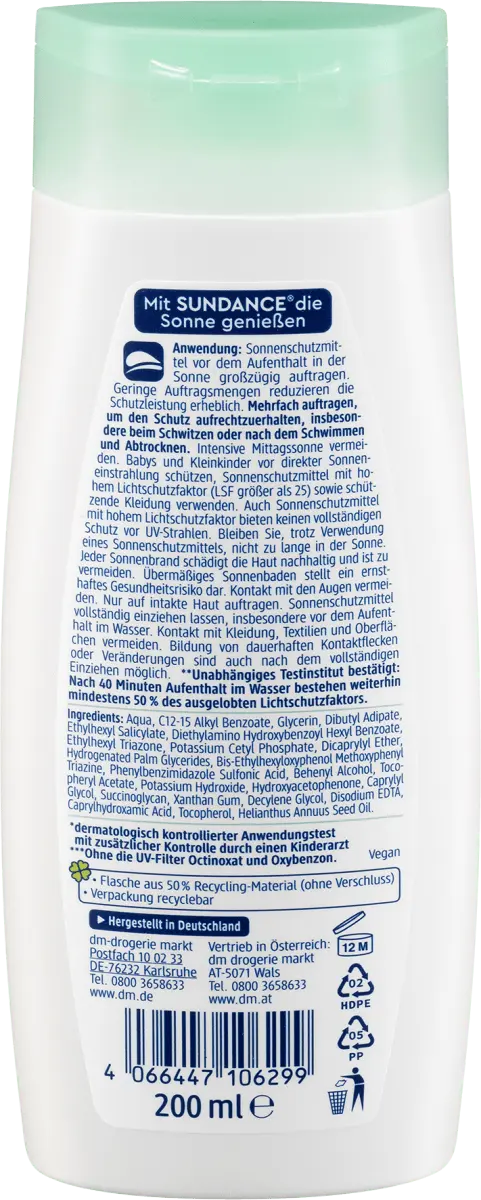 Описание продукта 24-часовой увлажняющий уход Для чувствительной кожи младенцев и детей Без отдушек и октокрилена Мгновенная защита Защита от UVA+UVB Веганское солнцезащитное молочко SUNDANCE Kids Sensitive , SPF 30 подходит для особо чувствительной к солнцу, незагорелой и чувствительной детской кожи и мгновенно и надежно защищает ее от солнечных ожогов. При регулярном использовании предотвращает преждевременное фотостарение кожи и появление пигментных пятен. Солнечное молочко также оказывает долговременное действие против высыхания кожи и обеспечивает приятное ощущение кожи. Совместимость с кожей дерматологически протестирована и подтверждена педиатром* (*дерматологически контролируемый тест на применение с дополнительным контролем педиатра), водонепроницаем** (**подтверждено независимым испытательным институтом: после 40 минут пребывания в воде не менее 50% заявленного на солнце фактор защиты все еще существует) и соответствует Закону о гавайских рифах*** (***Без УФ-фильтров, октиноксата и оксибензона). Рецепт без микропластика и водорастворимых, чисто синтетические полимеры. Состав Аква, C12-15 алкилбензоат, глицерин, дибутиладипат, Этилгексилсалицилат, диэтиламиногидроксибензоилгексилбензоат, этилгексилтриазон, цетилфосфат калия, дикаприлиловый эфир, гидрогенизированные пальмовые глицериды, бис-этилгексилоксифенол метоксифенилтриазин, фенилбензимидазолсульфоновая кислота, бегениловый спирт, токоферилацетат, гидроксид калия, гидроксиацето. фенон, каприлилгликоль, сукциногликан, ксантан камедь, дециленгликоль, динатрий ЭДТА, каприлгидроксамовая кислота, токоферол, масло семян Helianthus Annuus. Инструкция по применению . Перед пребыванием на солнце обильно нанесите солнцезащитный крем. Небольшие количества нанесения значительно снижают защитную эффективность. Наносите несколько раз для поддержания защиты, особенно при потоотделении или после купания и высыхания. Избегайте яркого полуденного солнца. Защищайте младенцев и маленьких детей от прямых солнечных лучей, используйте солнцезащитный крем с высоким фактором защиты от солнца (SPF более 25) и защитную одежду. Даже солнцезащитные кремы с высоким фактором защиты от солнца не обеспечивают полной защиты от ультрафиолетовых лучей. Даже если вы используете солнцезащитный крем, не оставайтесь на солнце слишком долго. Любой солнечный ожог вызывает длительное повреждение кожи, и его следует избегать. Чрезмерное загорание представляет серьезную опасность для здоровья. Избегайте попадания в глаза. Наносить только на неповрежденную кожу. Дайте солнцезащитному крему полностью впитаться, особенно перед пребыванием в воде. Избегайте контакта с одеждой, текстилем и поверхностями. Образование постоянных пятен контакта или изменения возможны даже после его полного поглощения.