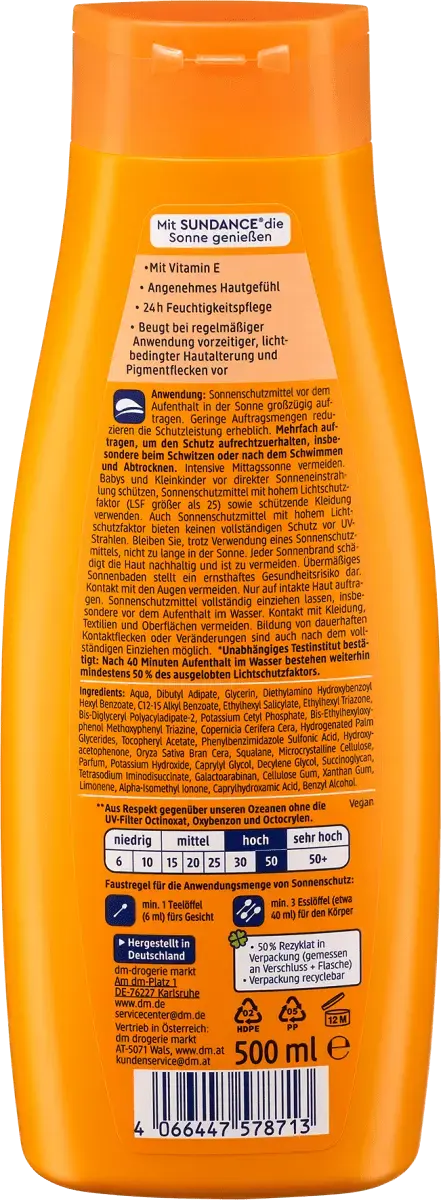 Веганское солнце SUNDANCE молочко SPF 50 с витамином Е — 24-часовое увлажняющее средство, придающее коже приятное ощущение. При регулярном использовании предотвращает преждевременное фотостарение кожи и образование пигментных пятен.Совместимость с кожей подтверждена дерматологически. Водонепроницаемость* (*Независимый испытательный институт подтверждает: после 40 минут пребывания в воде сохраняется не менее 50 % заявленного солнцезащитного фактора). Из уважения к нашим океанам, без УФ-фильтров октиноксата, оксибензона и октокрилена. Номер позиции Vegan