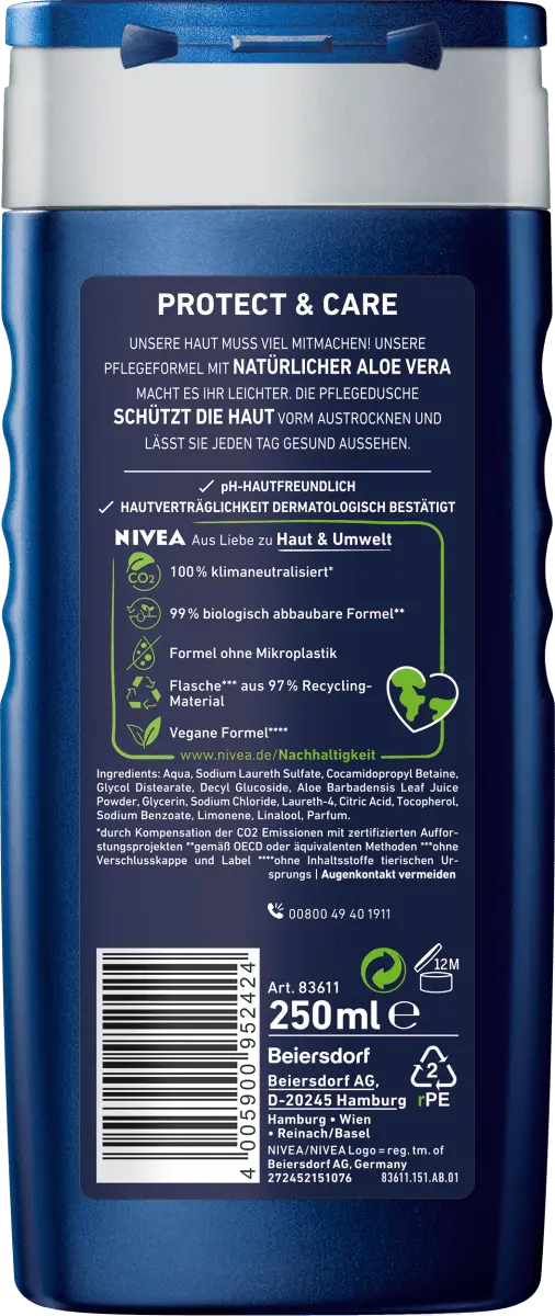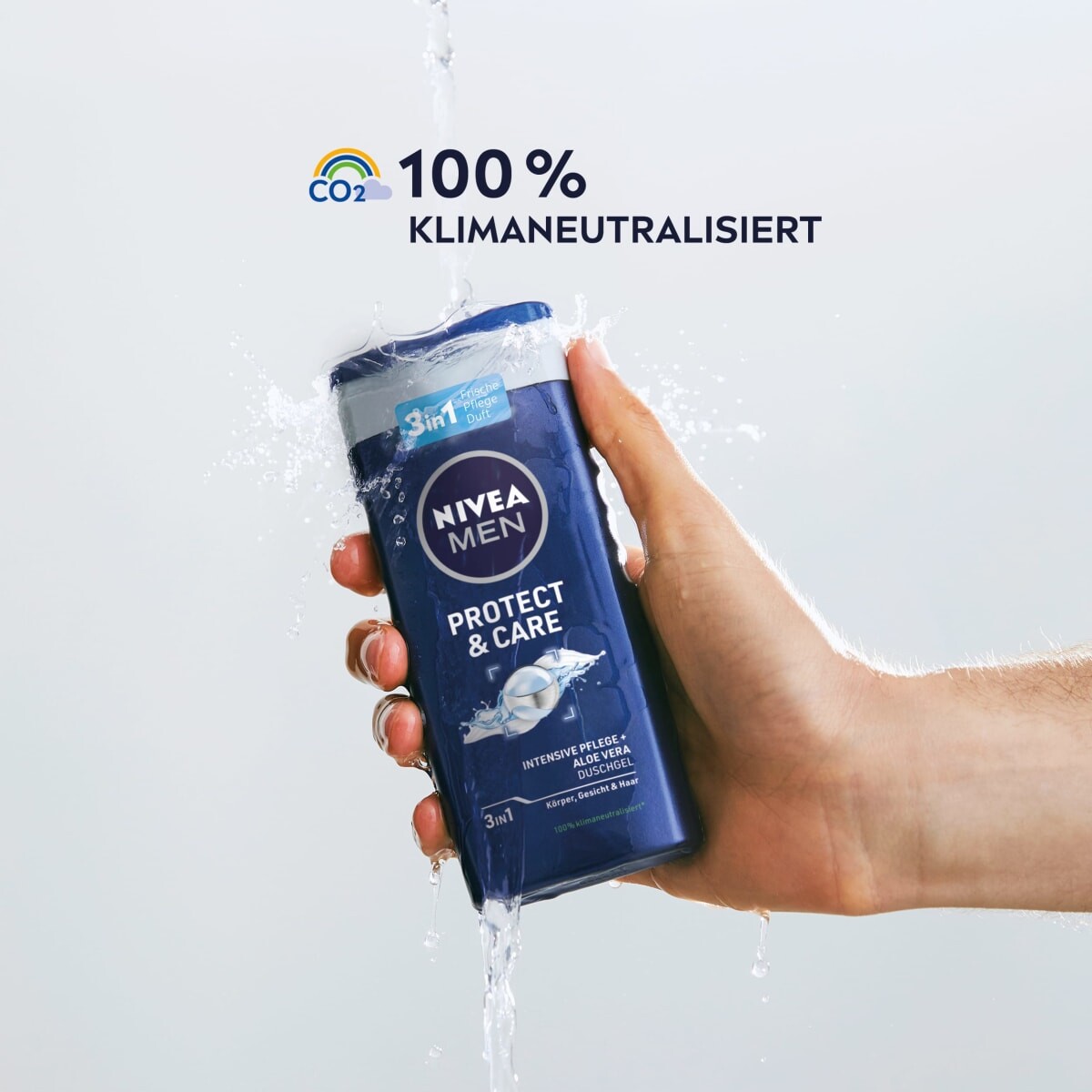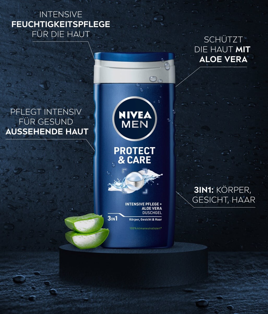>Откройте для себя Наслаждайтесь мощными ощущениями под душем с уходовым душем NIVEA MEN Protect & Care. Гель для душа с питательной формулой с алоэ вера очищает кожу и дарит ощущение интенсивного увлажнения. Кроме того, кожа защищена от пересыхания. Формула не содержит микропластика и водорастворимых, чисто синтетических полимеров и на 99% биоразлагаема. Упаковка, за исключением крышки и этикетки, на 97 % изготовлена ​​из переработанного материала.