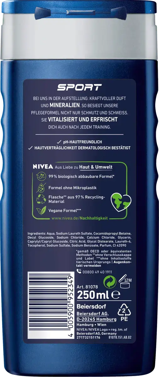 Освежающая NIVEA МУЖЧИНЫ Гель для душа Sport 24H Fresh – восстанавливающий уход после потных занятий. Он также придает коже ощущение интенсивного ухода и длительной свежести благодаря формуле с минералами. Формула не содержит микропластика и водорастворимых, чисто синтетических полимеров и на 99% биоразлагаема. Упаковка, за исключением крышки и этикетки, на 97 % изготовлена ​​из переработанного материала.