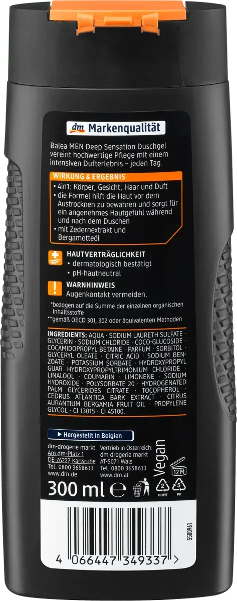 Гель для душа Deep Sensation от Balea MEN сочетает в себе высококачественный уход с интенсивным ароматом – каждый день. Гель для душа распространяет привлекательный аромат бергамота и кедра. Рецепт без микропластика и водорастворимых, чисто синтетических полимеров. *на основе суммы отдельных органических ингредиентов. **согласно OECD 301,302 или эквивалентным методам.