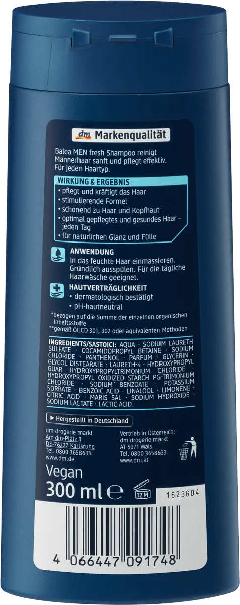 Шампунь Balea MEN Fresh питает укрепляет и бережно воздействует на волосы и кожу головы. Стимулирующая формула с морскими минералами подходит для любого типа волос. Для оптимального ухода и здоровья волос с естественным блеском и пышностью. Рецепт без микропластика и водорастворимых, чисто синтетических полимеров. *на основе суммы отдельных органических ингредиентов. **в соответствии с OECD 301, 302 или эквивалентными методами.