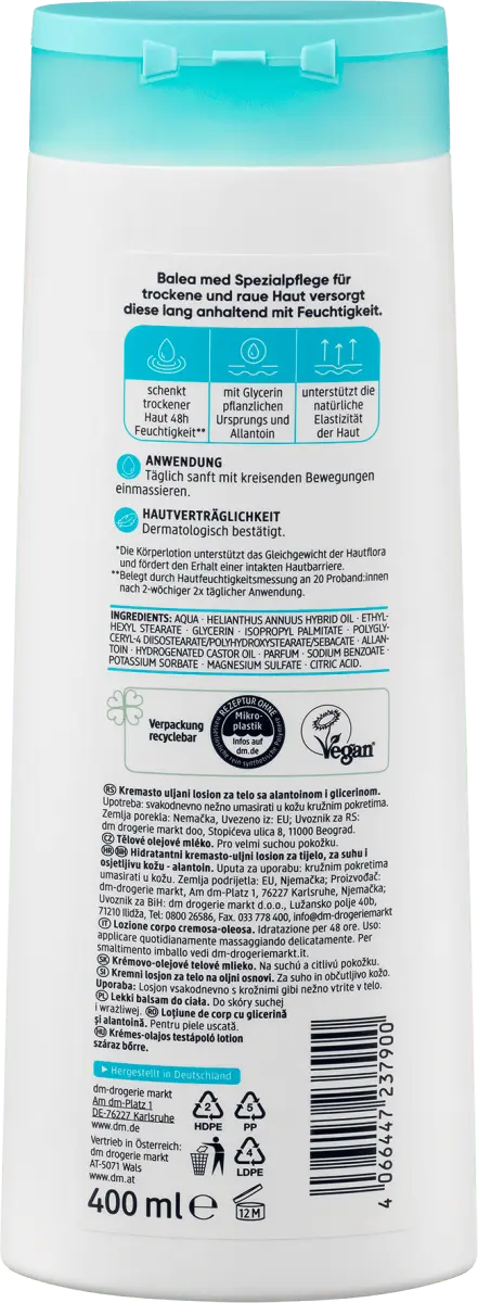 The Balea MED сливочное масло – это особый уход за сухой и огрубевшей кожей. Лосьон для тела обеспечивает длительное увлажнение на срок до 48 часов. Аллантоин и глицерин растительного происхождения поддерживают естественную эластичность кожи. Лосьон для тела поддерживает баланс флоры кожи и способствует поддержанию неповрежденного кожного барьера. **Подтверждено измерением влажности кожи на 20 испытуемых после 2 недель применения два раза в день.