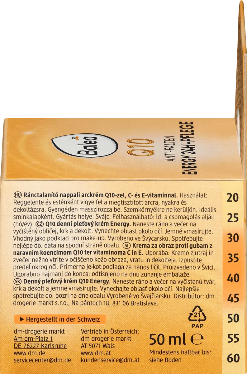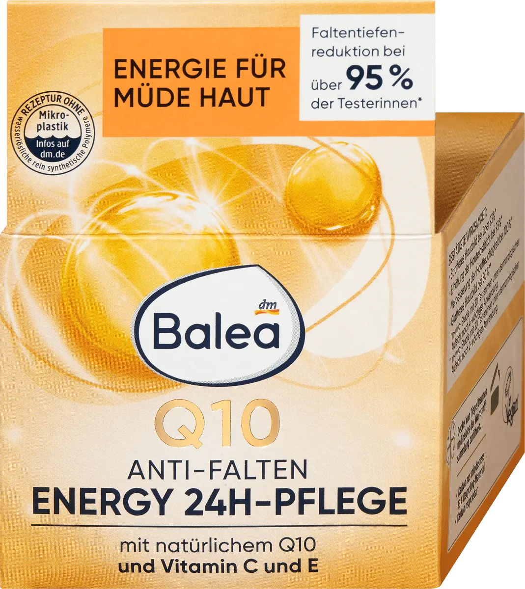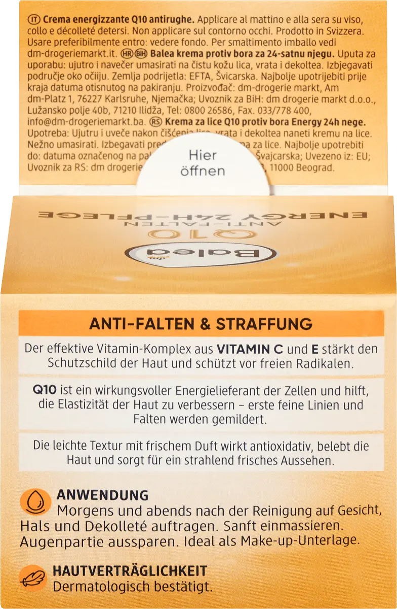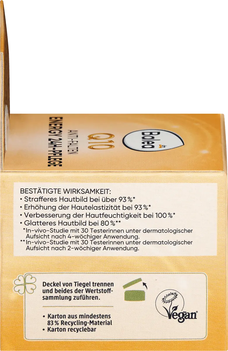 Укрепляющий уход: Balea Q10 смягчает первые морщины и глубину морщин. Эффективный витаминный комплекс ВИТАМИНОВ С и Е укрепляет защитный барьер кожи и защищает от свободных радикалов. Q10 является эффективным поставщиком энергии для клеток и помогает улучшить эластичность кожи – уменьшаются первые тонкие линии и морщины. Легкая текстура со свежим ароматом оказывает антиоксидантное действие, бодрит кожу и придает ей сияющий свежий вид. *Исследование in vivo с участием 30 тестеров под наблюдением дерматологов после 4 недель использования. Рецептура без микропластика и без водорастворимых, чисто синтетические полимеры