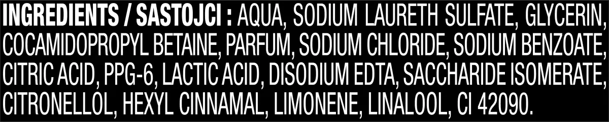 Состав: вода, лауретсульфат натрия, глицерин, кокамидопропилбетаин, хлорид натрия. , отдушка, бензоат натрия, лимонная кислота, PPG-6, молочная кислота, динатриевая соль ЭДТА, изомерат сахарида, гексилциннамал, лимонен, линалоол, CI 42090.