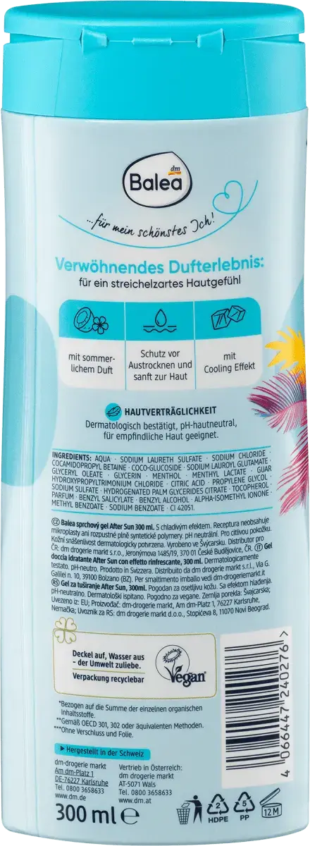 Гель для душа после загара от Balea с летним ароматом дарит ощущение мягкости кожи и расслабляющий аромат с охлаждающим эффектом. Мягкая формула защищает кожу от высыхания, удаляя остатки хлора, соленой воды и солнцезащитного крема. Рецепт без микропластика и водорастворимых, чисто синтетических полимеров. Корпус бутылки изготовлен из 100% переработанного материала (без крышки и фольги).