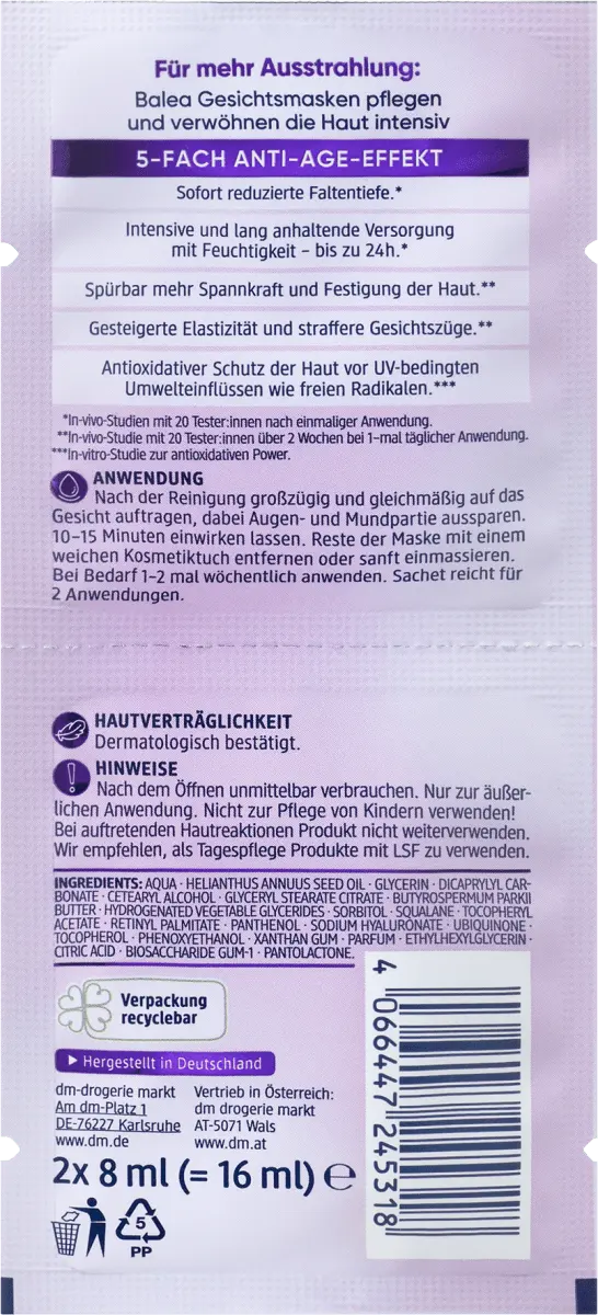 Маска Balea Retinol с Комплекс активных ингредиентов Ретинол, растительный сквалан и витамин Е оказывают пятикратное действие против признаков старения кожи. Формула обеспечивает немедленное уменьшение глубины морщин* и обеспечивает коже интенсивное и длительное увлажнение — до 24 часов*. Результатом является заметное повышение эластичности и упругости кожи, а также повышение эластичности и упругость черт лица**. Маска для лица также обеспечивает антиоксидантную защиту кожи от воздействия окружающей среды, связанного с УФ-излучением, например, от свободных радикалов.*** Формула без микропластика и водорастворимых, чисто синтетических полимеров. *Исследования in vivo с участием 20 тестеров после однократного применения. **Исследование in vivo с участием 20 тестировщиков в течение 2 недель при использовании 1 раз в день. ***Исследование антиоксидантной силы in vitro.