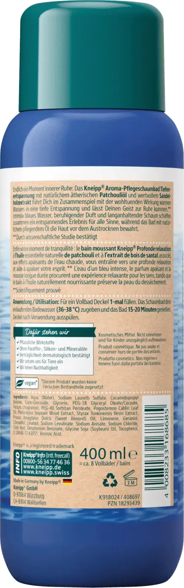 Жемчужная ванна глубокой релаксации от Kneipp подарит вам момент внутреннее спокойствие. Пена Kneipp Aroma Care Foam Bath Deep Relaxation с натуральным эфирным маслом пачули и ценным экстрактом сандалового дерева в сочетании с благотворным действием теплой воды приводит вас к глубокому расслаблению и позволяет вашему разуму успокоиться (подтверждено научными исследованиями).