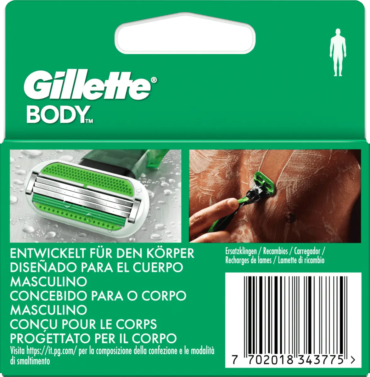 Лезвия Gillette Body были специально разработаны для бритья мужского тела. Три лезвия PowerGlide и полоски Lubrastrips обеспечивают безопасное и бережное бритье на любой части тела. Закругленная головка лезвия также адаптируется к сложным участкам тела. Эти лезвия можно использовать с аппаратом Gillette Body.
