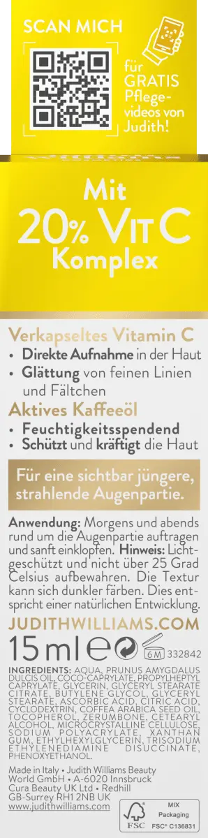 SOS поможет избавиться от темных кругов, морщин и усталости глаз. Крем для глаз Judith Williams с витамином C плюс содержит активное кофейное масло. Это увлажняет, защищает и укрепляет кожу. Уменьшает мешки и темные круги под глазами, делая область вокруг глаз заметно моложе и сияющей. Совместимость прошла дерматологические испытания.