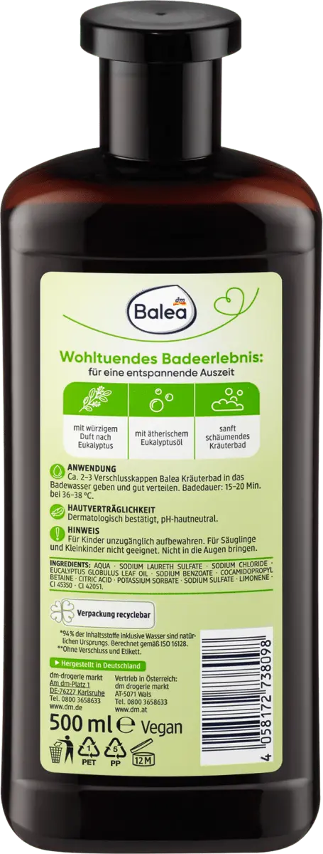 Травяная ванна с эвкалиптом Balea обеспечивает успокаивающий отдых для тела и души. Нежно пенящаяся травяная ванна с эфирным маслом эвкалипта подарит вам балансирующее ощущение купания. Рецепт без микропластика и водорастворимых, чисто синтетических полимеров. Корпус бутылки изготовлен из 100% переработанного материала (без крышки и этикетки).