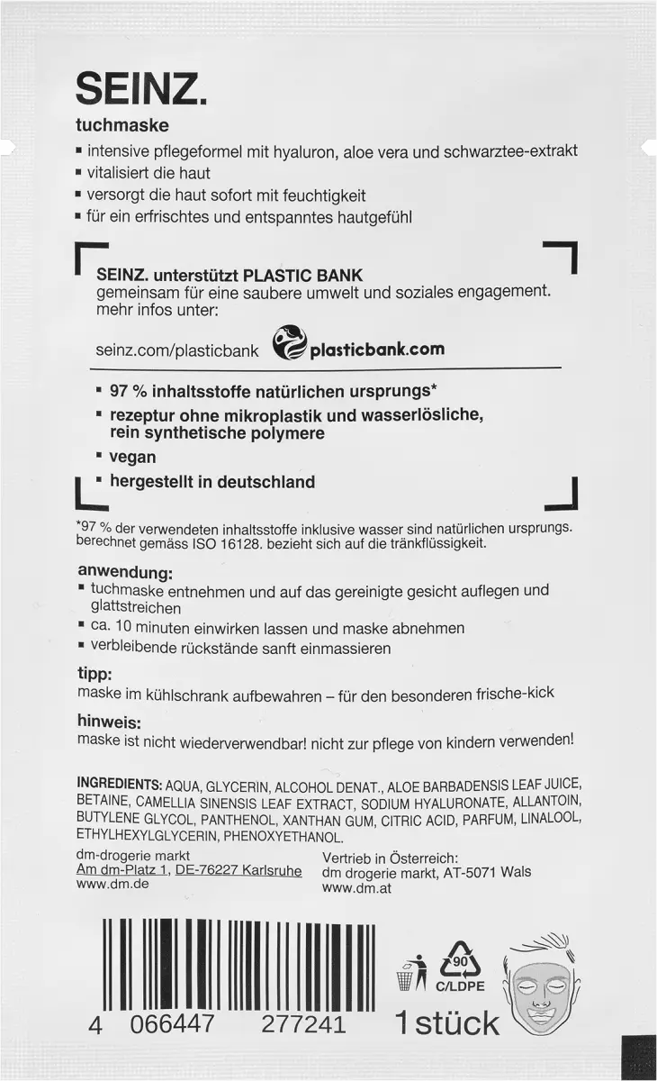 SEINZ. Тканевая маска содержит формулу интенсивного ухода с гиалуроновой кислотой, алоэ вера и экстрактом черного чая. Оживляет кожу и мгновенно обеспечивает ее увлажнением. Для ощущения свежести и расслабления кожи.
