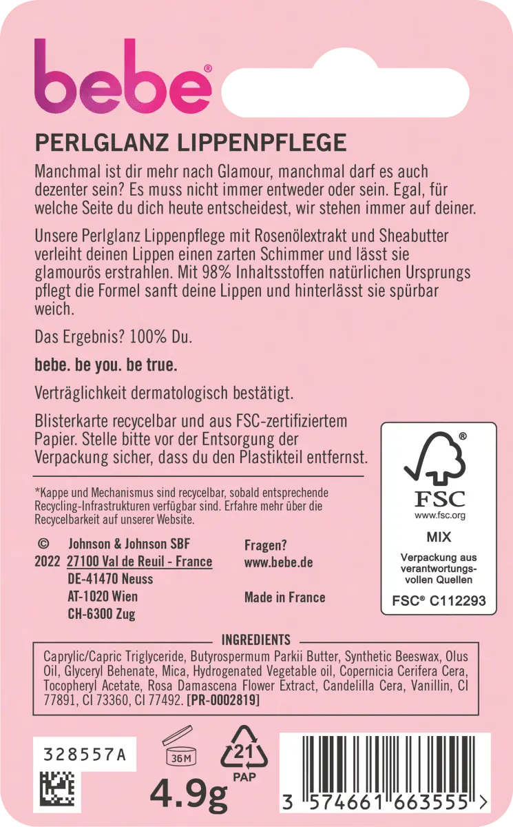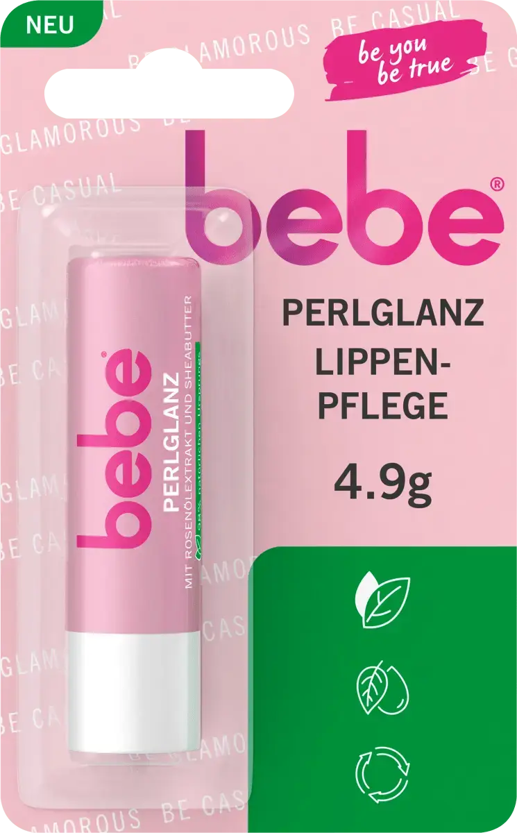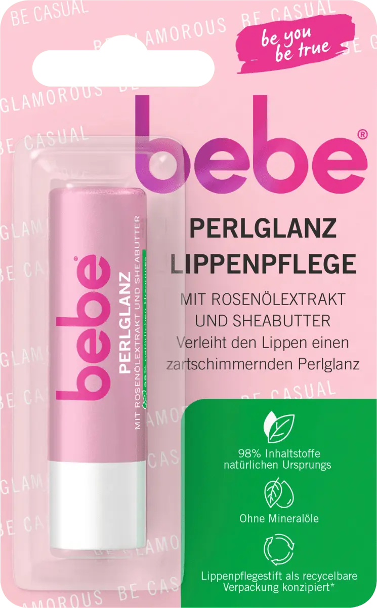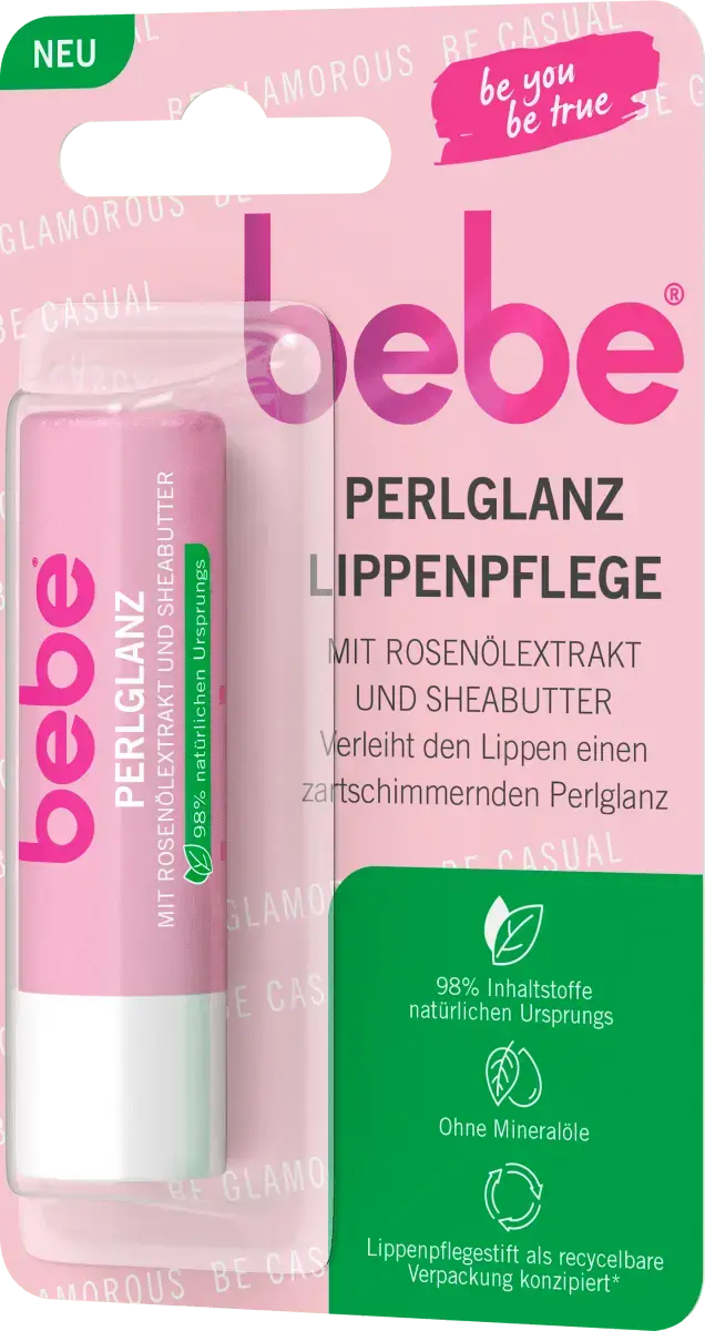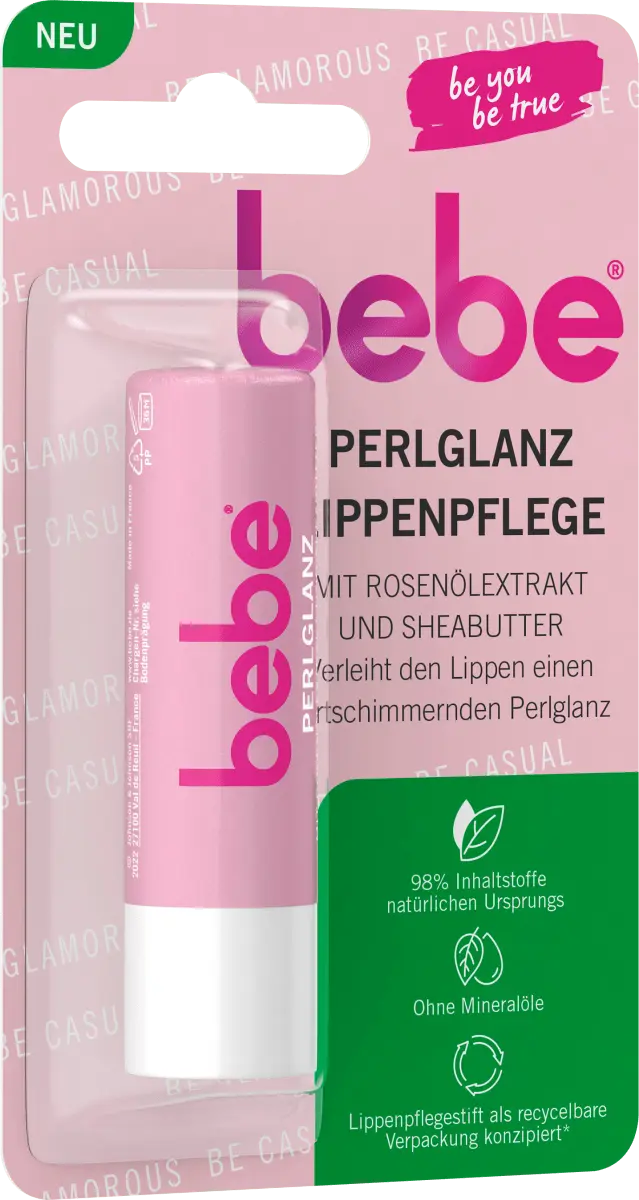Перламутровый уход за губами bebe с экстрактом розового масла и маслом ши придает губам нежное мерцание и заставляет их сиять гламурно. Формула, состоящая из 98% ингредиентов натурального происхождения, нежно ухаживает за вашими губами и делает их заметно мягкими. Бальзам для губ представляет собой упаковку, пригодную для вторичной переработки (крышка и механизм подлежат вторичной переработке, как только появится соответствующая инфраструктура для переработки — узнайте больше о возможности вторичной переработки на веб-сайте bebe), блистерная карта подлежит вторичной переработке и изготовлена ​​из бумаги, сертифицированной FSC.