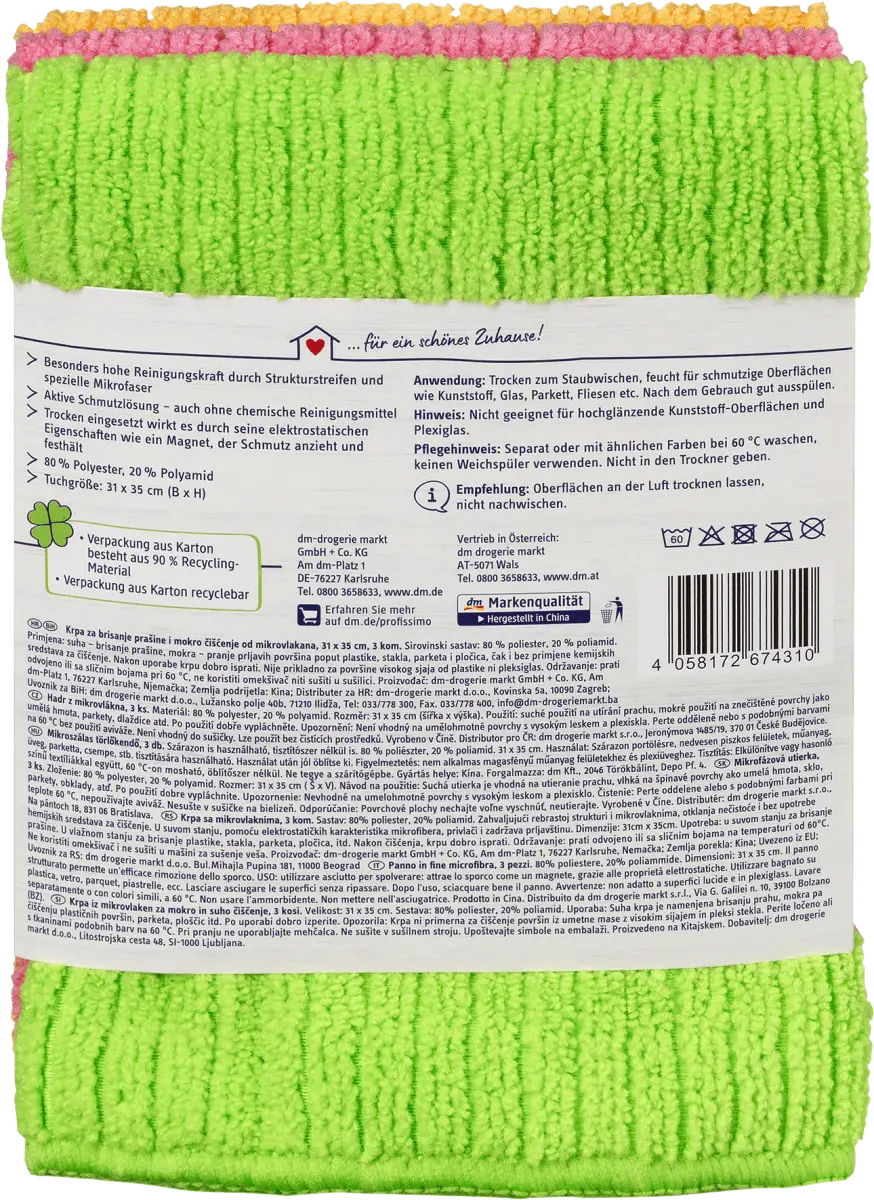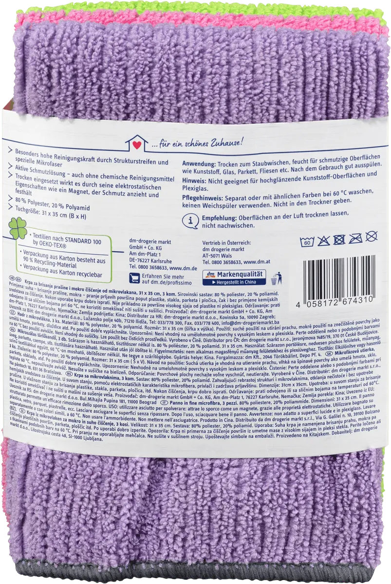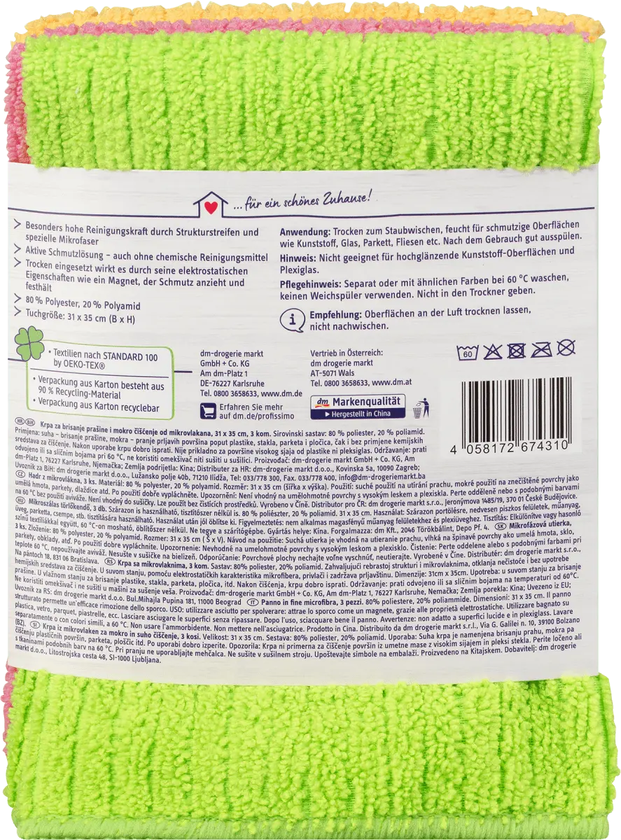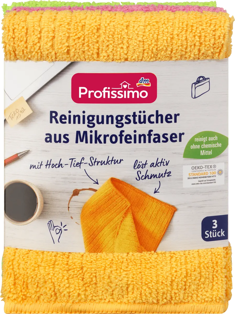 Чистящие салфетки Profissimo из микротонкой ткани волокна активно растворяют грязь и очищают глубоко в поры. Они обладают особенно высокой очищающей способностью благодаря структурированным полоскам и специальной микрофибре. Сухой для удаления пыли, влажный для грязных поверхностей, таких как пластик, стекло, паркет, плитка и т. д. Тонкие микроволокна проникают даже в самые маленькие углубления и растворяют даже стойкие загрязнения - даже без использования химических чистящих средств. При использовании в сухом виде его электростатические свойства действуют как магнит, который притягивает и удерживает грязь.