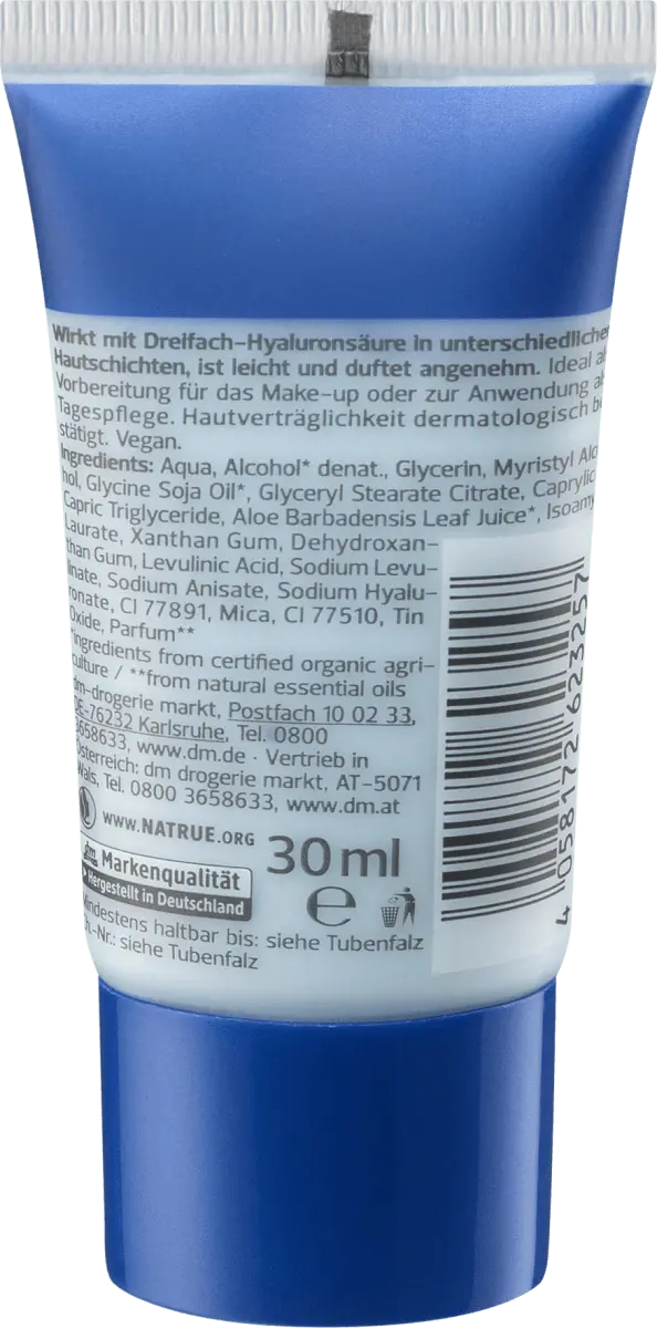 Гидропраймер под макияж от Натуральная косметика Alverde работает с тройной гиалуроновой кислотой в разных слоях кожи, легка и имеет приятный запах. Идеально подходит в качестве подготовки к макияжу или в качестве средства дневного ухода. Рецепт без микропластика и водорастворимых, чисто синтетических полимеров.