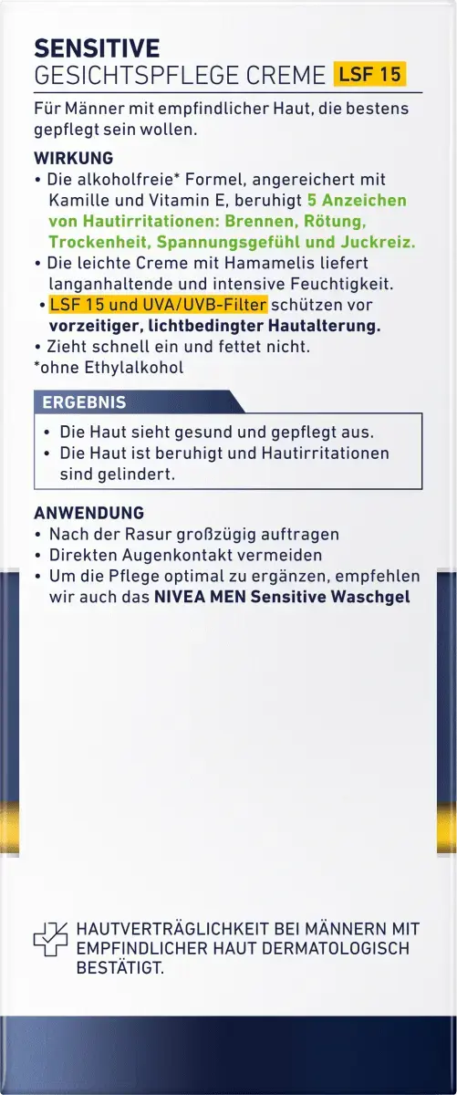 Тщательно освежите кожу с помощью чистящих средств NIVEA. Утром обильно наносите на кожу мужской уход за лицом SPF 15. Впитывается моментально, не жирнит. Для достижения оптимальных результатов мы рекомендуем использовать другие продукты серии Sensitive.