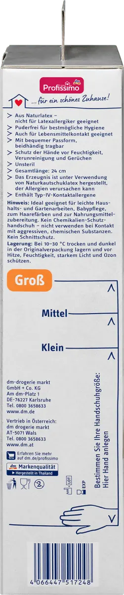 Белые латексные одноразовые перчатки Profissimo большого размера не содержат пудры и обеспечивают максимальную гигиену. Перчатки из натурального латекса, сертифицированного FSC, можно носить обеими руками, они обеспечивают защиту рук от влаги, загрязнений и запахов. Поэтому одноразовые перчатки идеально подходят для легкой работы по дому и в саду, для окрашивания волос и приготовления пищи.