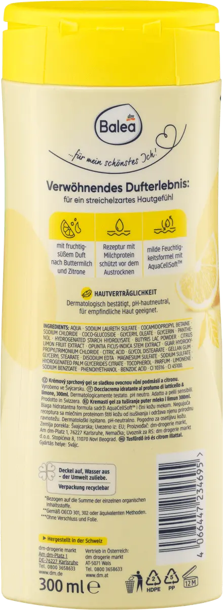 >Крем-душ для душа «Пахта и лимон» от Balea придает вашей коже ощущение мягкости и комфорта и балует ваши чувства фруктовым, сладким ароматом пахты и лимона. Формула с молочным протеином защищает кожу от высыхания и подходит для чувствительной кожи. Рецепт без микропластика и водорастворимых, чисто синтетических полимеров. Корпус бутылки изготовлен из 100% переработанного материала (без крышки и фольги).
