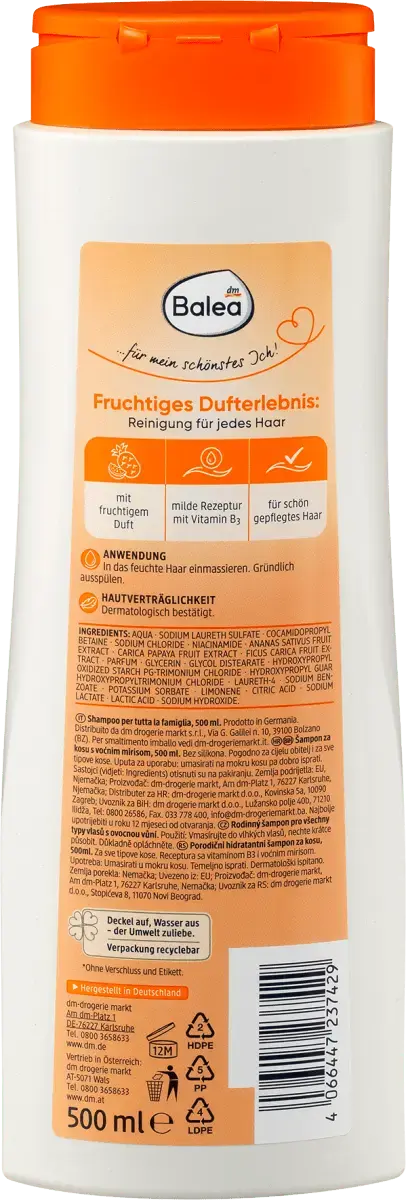 Ощущение фруктового аромата: семейство шампуней Balea предлагает фруктовый аромат Очищение для каждого волоса. Мягкая формула с витамином B3 для красивого ухода за волосами. Рецепт без микропластика и водорастворимых, чисто синтетических полимеров. *Упаковка содержит не менее 70 % переработанного материала.