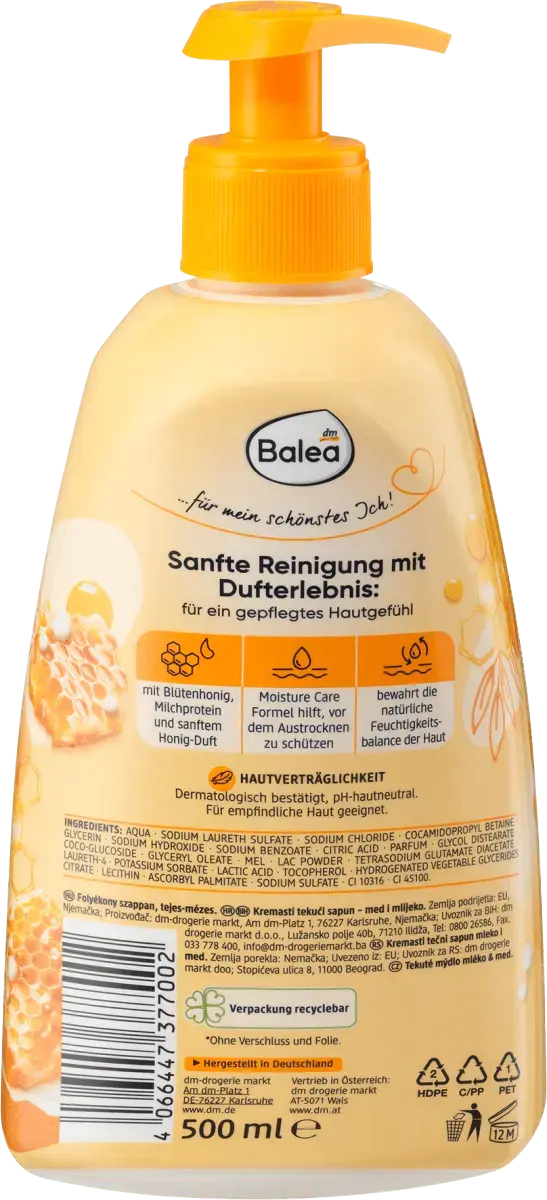 Крем-мыло Balea с молоком и медом сохраняет естественный баланс влаги в коже. Формула Moisture Care защищает от высыхания. Рецепт без микропластика и водорастворимых, чисто синтетических полимеров.