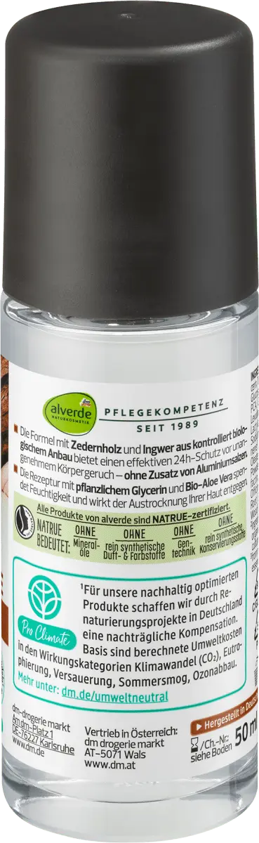 Формула Alverde MEN Deodorant Roll-On Rough Nature с кедровым деревом и имбирем из сертифицированного органического земледелия обеспечивает эффективную 24-часовую защиту от неприятного запаха тела - без добавления солей алюминия. Формула с растительным глицерином и органическим алоэ вера увлажняет и противодействует высыханию кожи, не оставляя белых следов дезодоранта. Рецепт без микропластика и водорастворимых, чисто синтетических полимеров. *Мы создаем последующую компенсацию за нашу экологически оптимизированную продукцию посредством проектов ренатурации в Германии. В основе рассчитаны экологические издержки по категориям воздействия: изменение климата (CO2), эвтрофикация, подкисление, летний смог, разрушение озона. Оценка жизненного цикла по состоянию на 06.2023; Основа для расчета экологических затрат: CE-Delft 2020