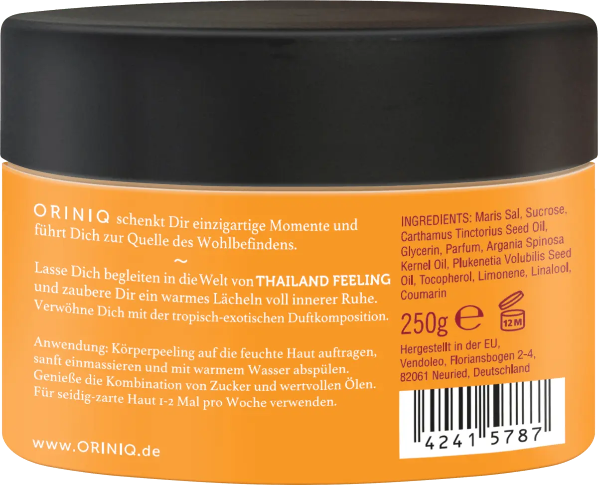 Позвольте этому уйти Окунитесь в мир ТАЙЛАНДСКОГО ЧУВСТВА с масляным пилингом zucler от Oriniq и вызовите в воображении теплую улыбку, полную внутреннего покоя. Тропически-экзотическая композиция аромата представлена ​​нотами бергамота, апельсина и зеленого эвкалипта. Пряные элементы сочетаются с растительными нотками бамбуковой рощи. Цветы апельсина обволакивают аромат.