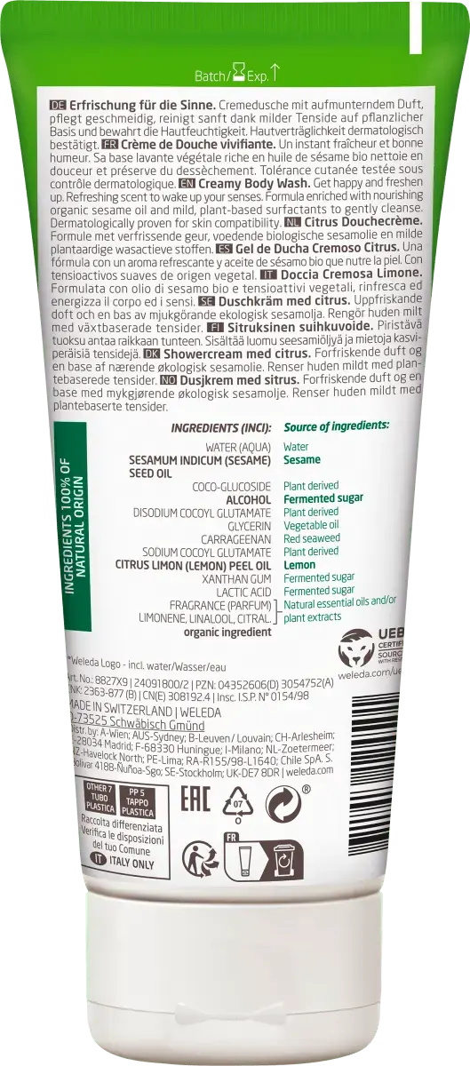 Крем-душ «Цитрусовый» от Weleda. Их ободряющий аромат освежает ваши чувства. Он также обеспечивает мягкий уход, мягко очищает благодаря мягким поверхностно-активным веществам растительного происхождения и сохраняет влагу в коже. Совместимость с кожей подтверждена дерматологически.