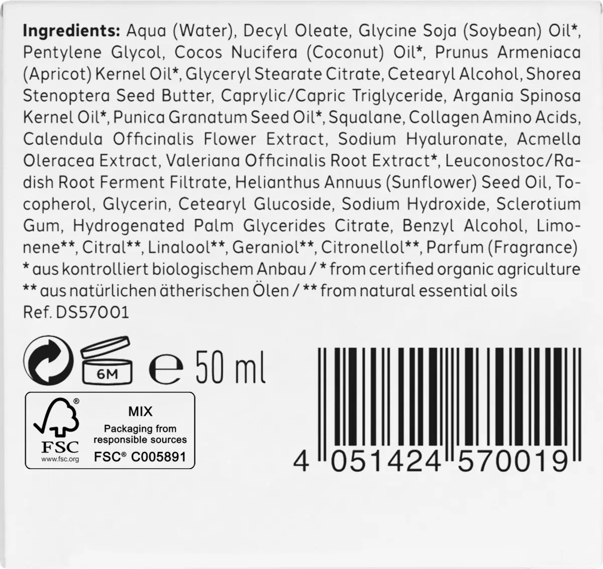 AQUA (ВОДА),ДЕЦИЛ ОЛЕАТ,ГЛИЦИН Соя ( Соевое масло*, пентиленгликоль, масло Cocos Nucifera (кокосовое)*, масло косточек Prunus Armyca (абрикоса)*, глицерилстеарат цитрат, цетеариловый спирт, масло семян Shorea Stenoptera, каприловый/каприновый триглицерид, масло косточек Argania Spinosa*, PUNICA GRANATUM МАСЛО СЕМЯН*, СКВАЛАН, АМИНОКИСЛОТЫ КОЛЛАГЕНА, ЭКСТРАКТ ЦВЕТКОВ КАЛЕНДУЛЫ ЛЕКАРСТВЕННОЙ, ГИАЛУРОНАТ НАТРИЯ, ЭКСТРАКТ АКМЕЛЛЫ ОЛЕРАЦЕЙНОЙ, ЭКСТРАКТ КОРНЯ ВАЛЕРИАНЫ*, ЛЕЙКОНОСТОК/ФИЛЬТРАТ КОРНЯ РЕДИСКИ, МАСЛО СЕМЯН HELIANTHUS ANNUUS (ПОДСОЛНЕЧНИК), ТОКОФЕР ОЛ, ГЛИЦЕРИН, ЦЕТЕАРИЛ ГЛЮКОЗИД, ГИДРОКСИД НАТРИЯ, СКЛЕРОЦИЕВАЯ КАМЕНЬ, ГИДРОГЕНИРОВАННЫЙ ПАЛЬМОВЫЙ ГЛИЦЕРИД ЦИТРАТ, БЕНЗИЛОВЫЙ СПИРТ, ЛИМОНЕН**, ЦИТРАЛ**, ЛИНАЛООЛ**, ГЕРАНИОЛ**, ЦИТРОНЕЛЛОЛ**, ПАРОДУХ (АРОМАТИЗАЦИЯ) *из контролируемого органического выращивания/*из сертифицированного органического сельского хозяйства * *из натуральных эфирных масел/**из натуральных эфирных масел
