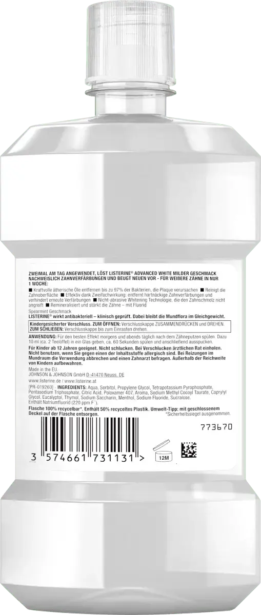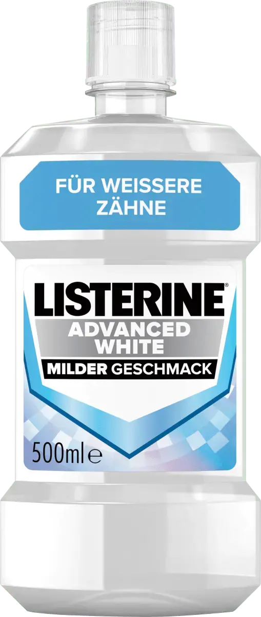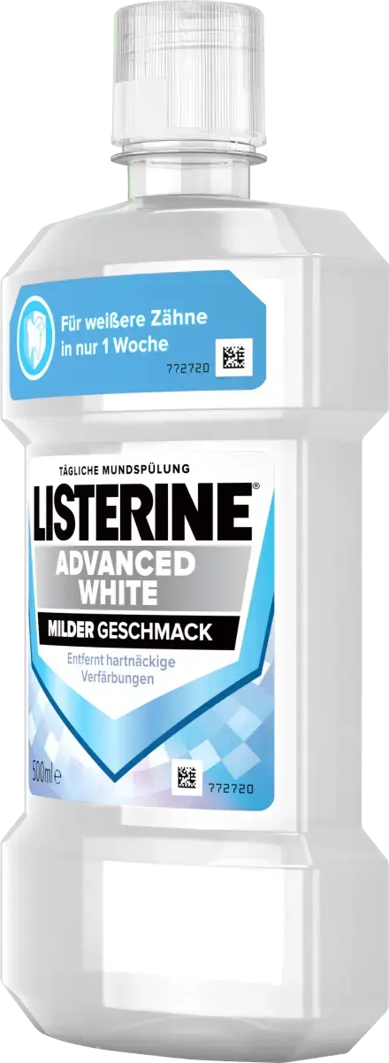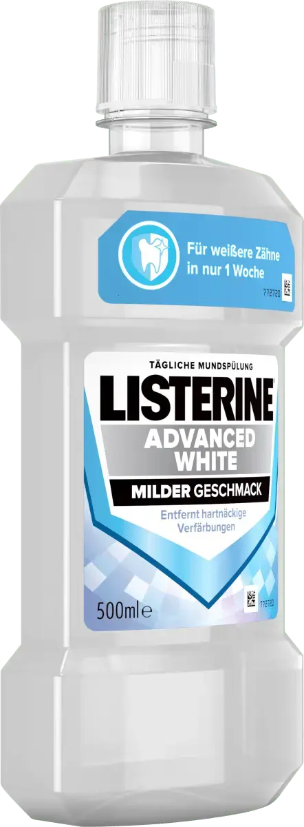 Полоскатель для рта Advanced White от Listerine борется с благодарностью Технология отбеливания не только удаляет стойкое обесцвечивание, но и предотвращает повторное обесцвечивание. Поскольку ополаскиватель обладает антибактериальным эффектом, удаляется до 97% бактерий, которые остаются после чистки зубов и вызывают налет. Поверхность зубов очищается, не повреждая зубную эмаль.