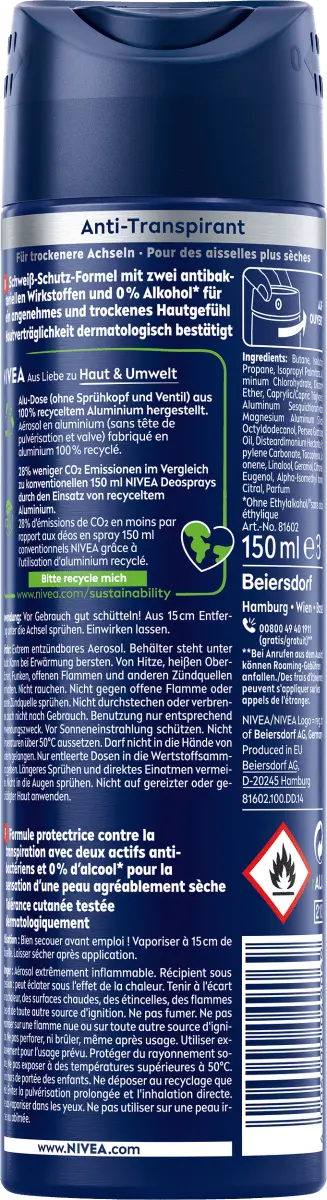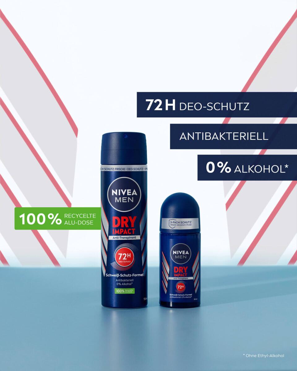 Дезодорант-спрей NIVEA MEN Dry Impact обеспечивает до 72 часов надежной антиперспирантной защиты. Высокоэффективная формула двойного действия эффективно борется с влажностью подмышек и тем самым предотвращает появление неприятных запахов. Дезодорант также придает мужественный, свежий аромат.