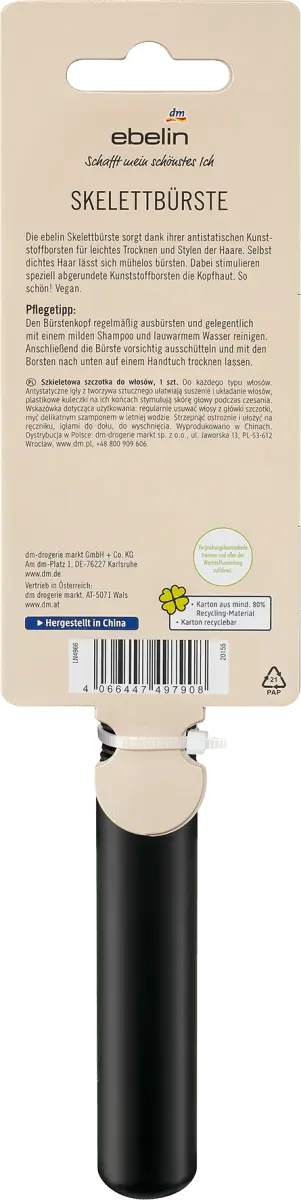 Скелетная щетка ebelin обеспечивает легкую сушку и укладку волос благодаря антистатическим пластиковым щетинкам. Даже густые волосы можно легко расчесать. Специально закругленные пластиковые щетинки стимулируют кожу головы. Этот товар доступен в различных цветах/мотивах. К сожалению, предварительно выбрать конкретный цвет или мотив для этого заказа невозможно.