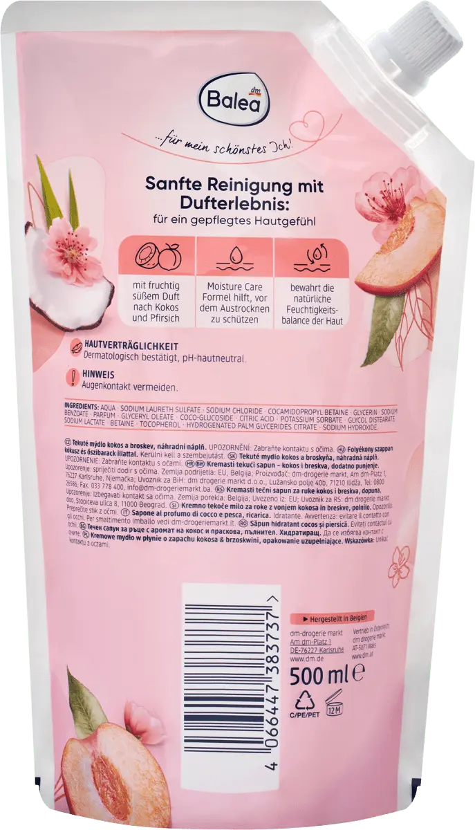 Суммарная упаковка крем-мыла Balea «Кокос и персик» с фруктово-сладким ароматом сохраняет кожу естественный баланс влаги. Формула Moisture Care защищает от высыхания. Состав без микропластика и водорастворимых, чисто синтетических полимеров.