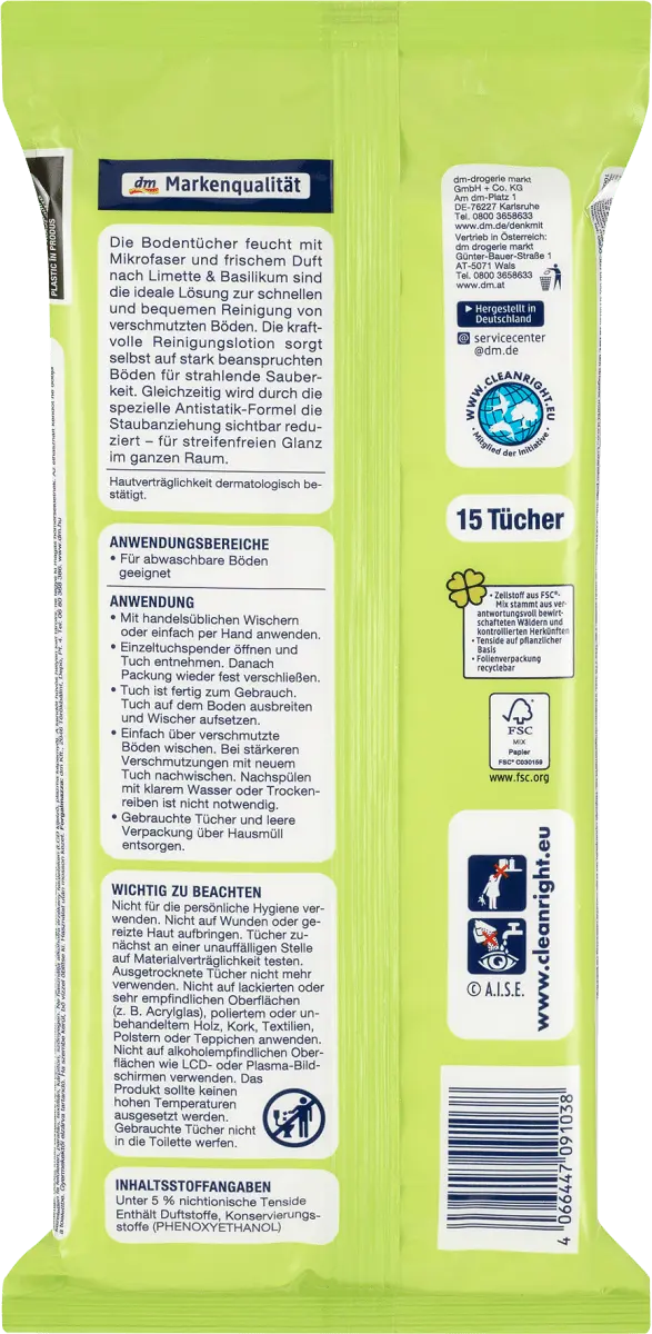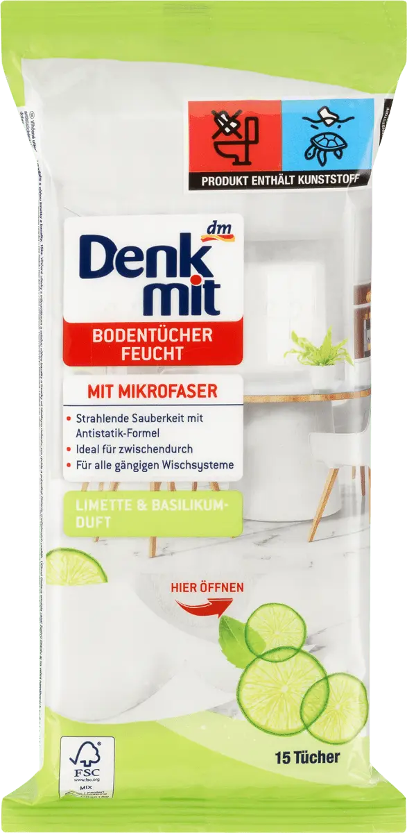 Влажные тряпки для пола Denkmit из микрофибры и имеют свежий аромат лайма и базилика — идеальное решение для быстрой и удобной очистки грязных полов. Мощный чистящий лосьон обеспечивает сверкающую чистоту даже на интенсивно используемых полах. В то же время специальная антистатическая формула заметно снижает притяжение пыли - обеспечивая блеск во всем помещении без разводов.